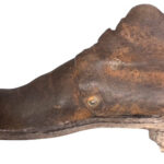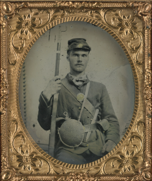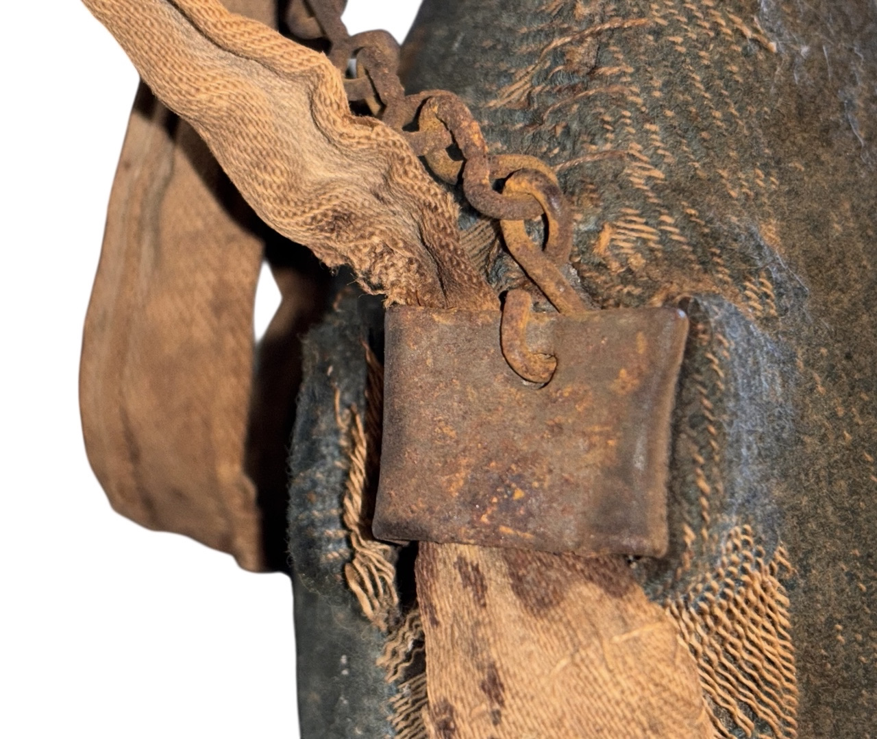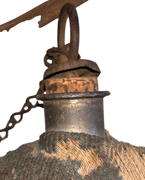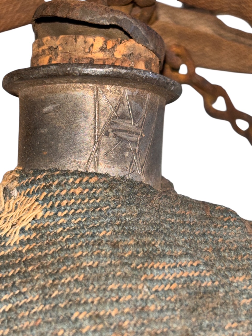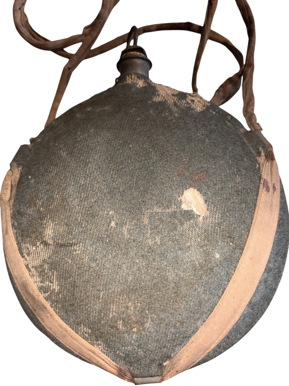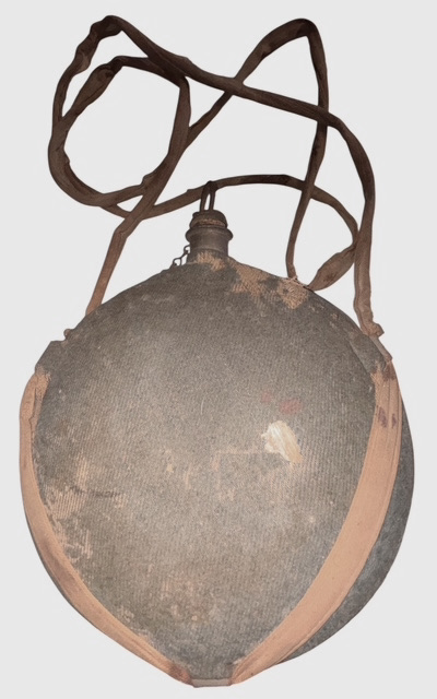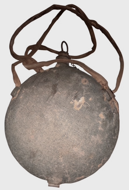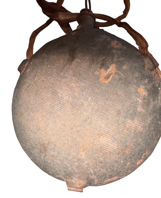Civil War Model 1858 Smooth Side Canteen with Sky Blue Wool Cover – This canteen is an excellent example of a war period, M1858 issue, smooth side canteen; the canteen retains its original, sky-blue wool cover, which is in overall very good condition, with a very few areas of loss. The folded, cotton sling is complete and somewhat soiled from period use and postwar storage, but remains strong; the sling courses through the three extant sling guides. The canteen retains its original stopper and chain; the chain is linked, via the correct small hole, in one of the upper sling guides. The pewter spout exhibits no maker’s name, although there are two initials scratched in it. These blue wool covered canteens have always been markedly more difficult to find.