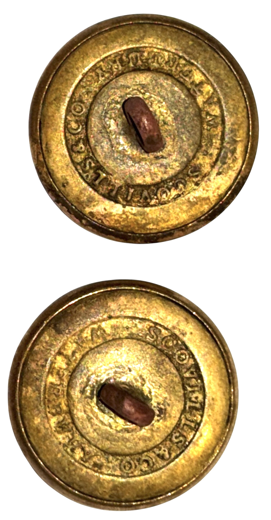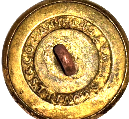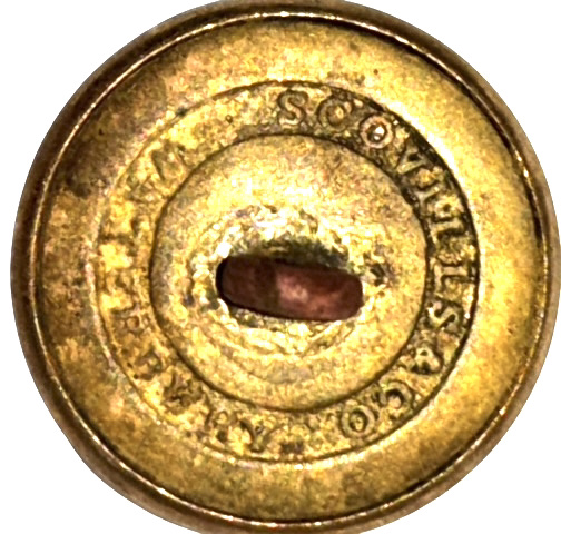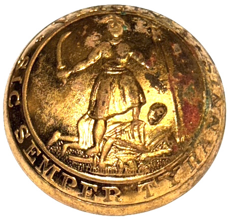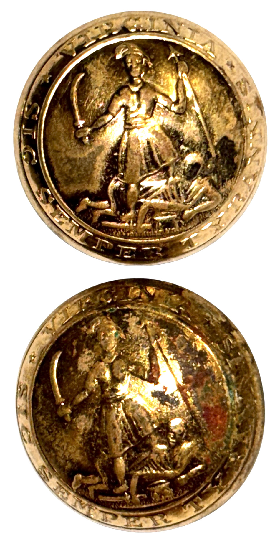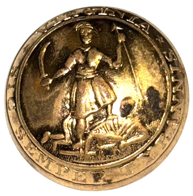 Civil War Non-Excavated Virginia State Seal Coat Size Buttons with RMDC Scovill Backmark (VA13) – These Virginia state seal coat buttons have the motto of Virginia around the edge – “SIC SEMPER TYRANNIS”; on the back of the buttons, the shanks remain firmly in place and are encircled with the correct Civil War maker’s mark of āScovill of Waterburyā in the rarer RMDC format. These buttons, discovered in an old home in the Lexington, Virginia area, along with three other similar Virginia buttons, may represent the remnants of a full complement of buttons from a Virginia Confederate officerās frock coat. The buttons remain in overall excellent condition with much bright gilt remaining; the buttons have some very small storage induced tarnish spots. Ā This is the style listed as figure VA13 in Albert’s book and VA222 in Tice’s book.*** Price for each button is $225