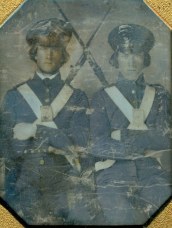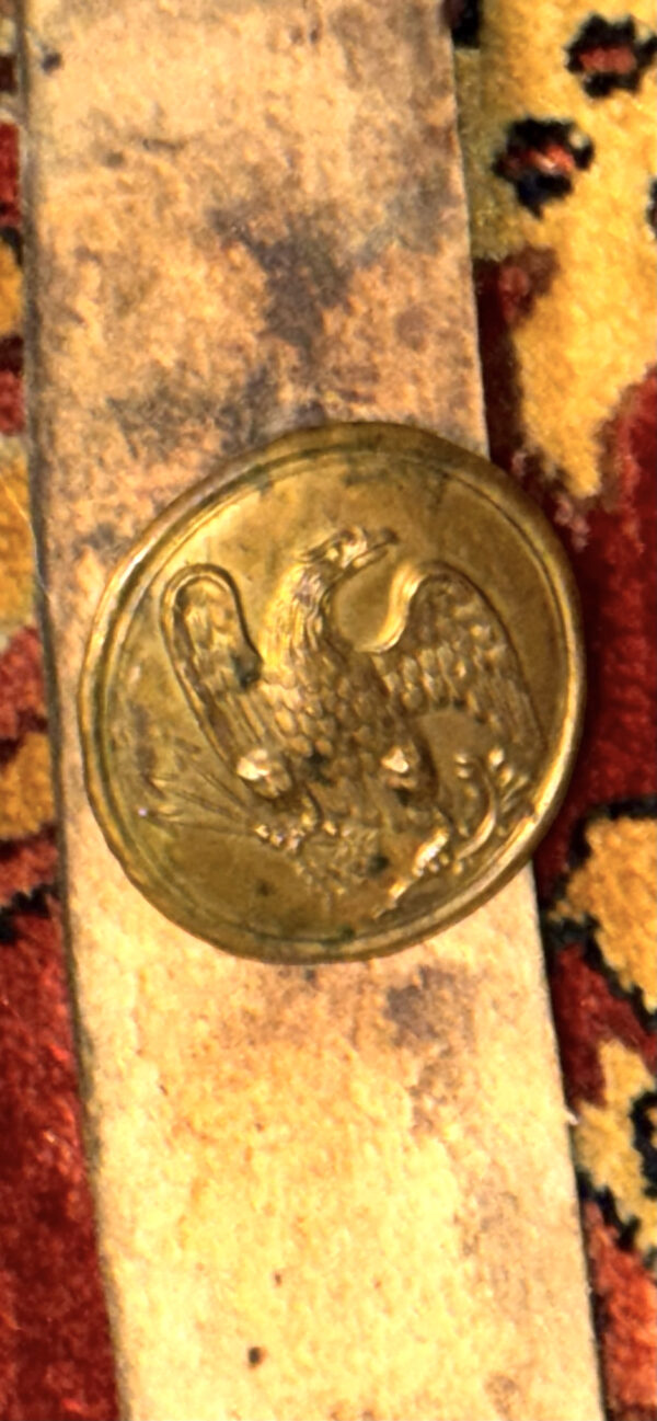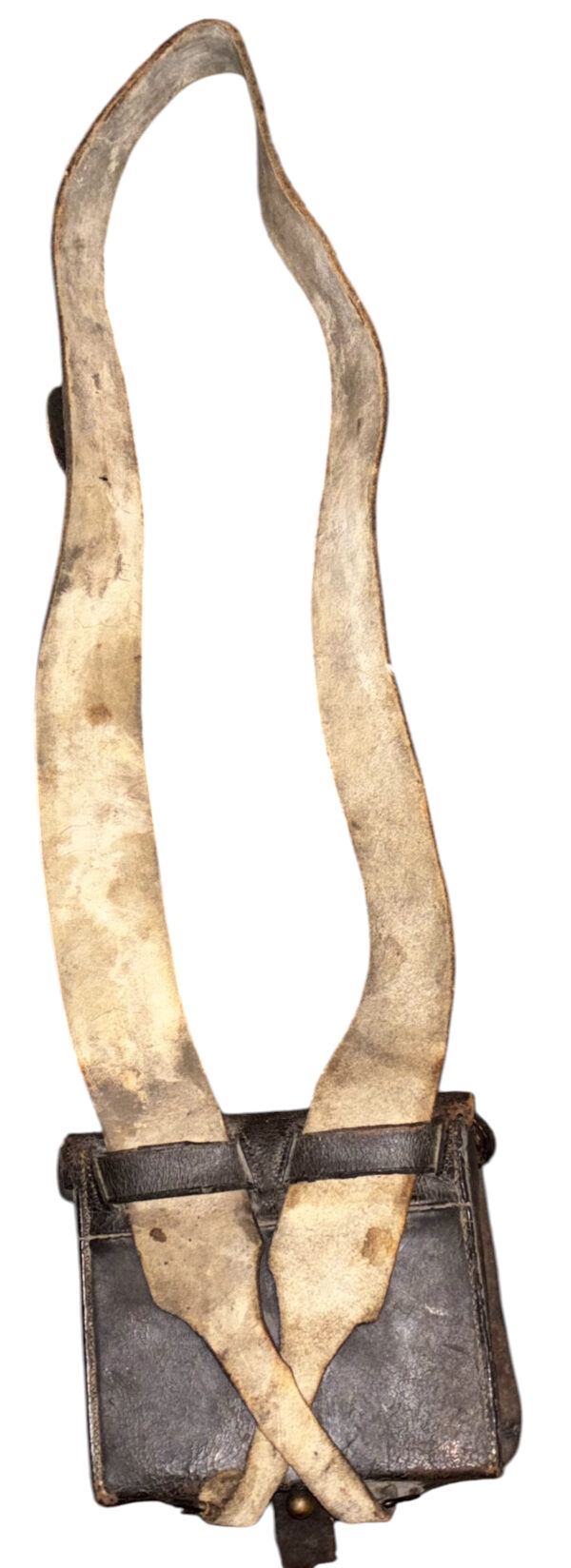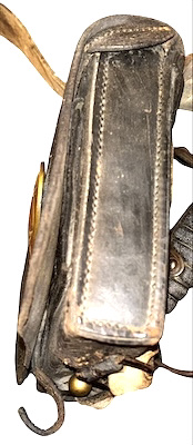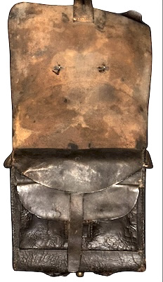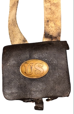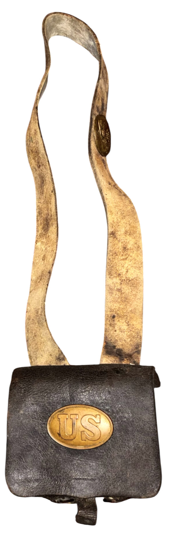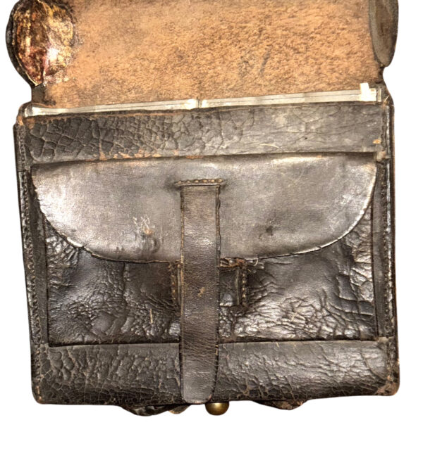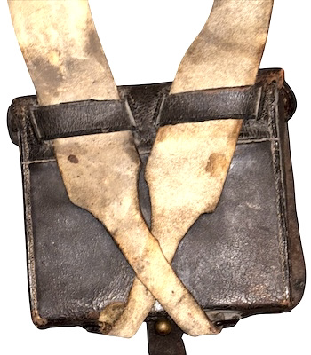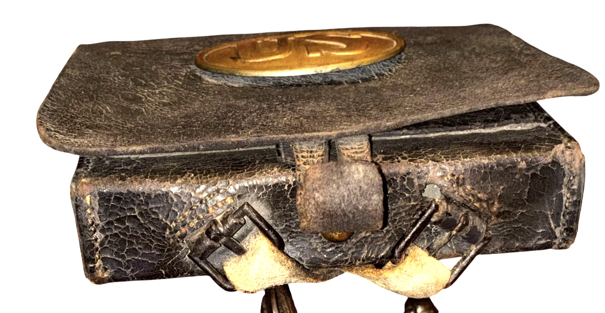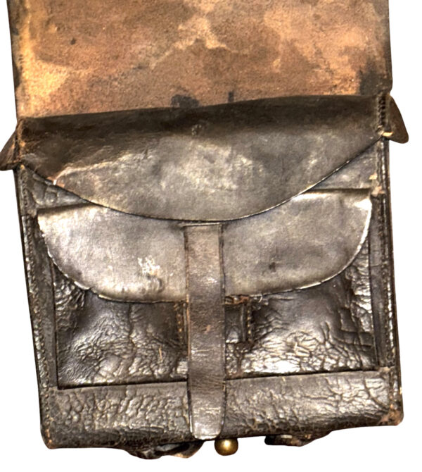 Pattern 1839 .69 Caliber Round Ball Cartridge Box – These boxes were produced as replacements for the aging 1828 musket box. The boxes were designed for sling carriage only, as there were no belt loops affixed to the back of the box. Army regulations stated that the boxes be capable of carrying 40 rounds of round ball or buck and ball ammunition. Initially, these boxes were issued with white buff leather slings; the slings did not change in style, from 1839 to 1865, although the composite material and color changed from buff leather, from white to black, then to black bridle leather; additionally, late in the 1850s, after many complaints by field soldiers, belt loops were added. The boxes were originally issued with US box plates and M1827 Eagle breast plates – this example retains both original plates. The box has an inside flap, covering the two cartridge tins, both of which remain in place, and an implements pouch. A complete and functional sewn latch tab remains in place, as does an early bulbous style, brass finial. The white buff sling retains its original white to cream coloration, although it is somewhat soiled from use and age – it remains in strong condition; the sling attachment roller buckles are both sewn in place. The box proper remains in overall very good condition, with some age crackling, but no flaking; we did have one of the box “ears” strengthened. These boxes are not often seen, especially in this condition, with both original plates and the white buff sling.