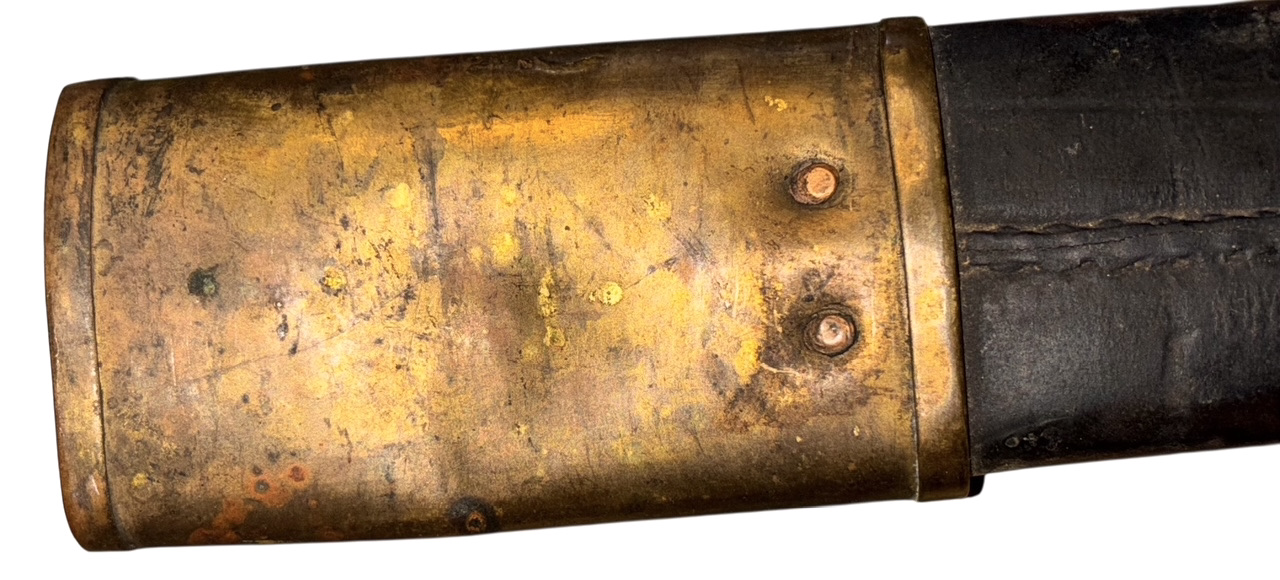 Unissued Scabbard for the U.S. Model 1855 Rifled Musket with Stamping Showing Manufacture by J.I. Pitman – Recently, we obtained the remnants of a large militaria collection gathered by a collector in the 1950s from Bannerman’s store on Broadway in New York City. The collection had been housed in a storage unit in a rural area in eastern Virginia, for many years. Contained in the collection was a somewhat wide range of eras of U.S. military items from pre-Civil War to WWI; we will be gradually cataloging the various items and slowly putting them on our site. Amongst the wide range of items was this fine condition, M1855 Saber Bayonet Scabbard; of note is the diminutive stamping on the back side of the scabbard, near the brass throat that reads: