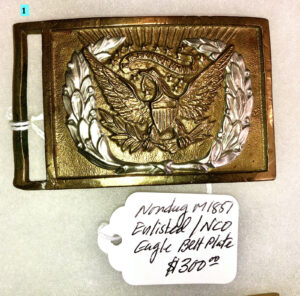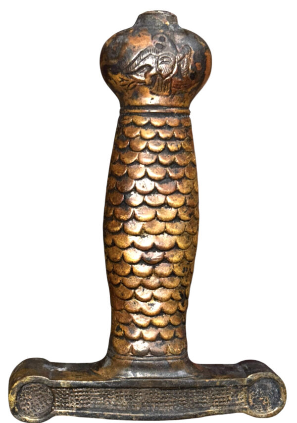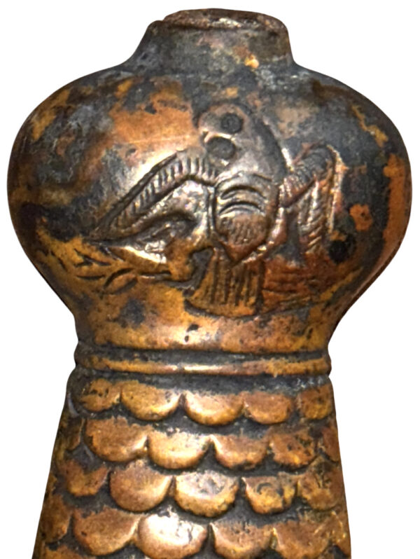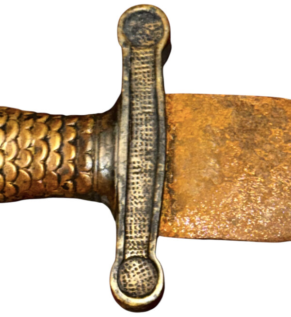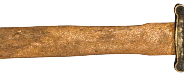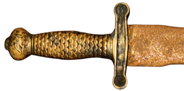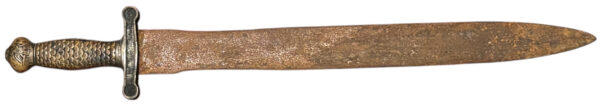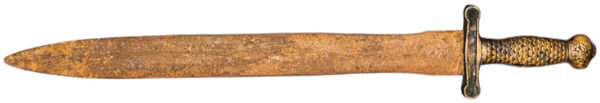 Barn Find M1832 Heavy Artillery Broad Sword – We recently obtained a highly significant,  50 year collection of primarily excavated artifacts; some of the components of the collection were not actually dug, but are early attic or barn finds, to include this M1832 Artillery broad sword; unfortunately, there were very few records kept by the collector, so the location where this sword was discovered will remain a mystery. Regardless, the sword remains in overall good condition – it exhibits some obvious surface rust (no flaking) on the blade – the blade remains strong with no metal loss; the cast brass hilt, with its characteristic simulated scales grip has a pleasing, mustard colored patina; the eagle with talons clutching olive branches, remains clearly stamped in both sides of the pommel; unusually, during the period of use, the cross guard was stippled on both sides – a feature not done when the sword was issued, but was added by the war period owner. The overall length of the sword is: 24.5”.