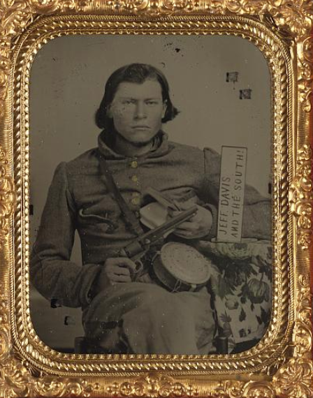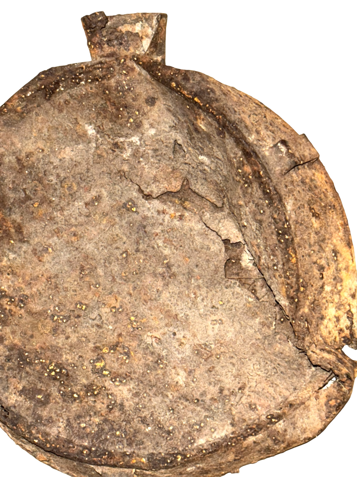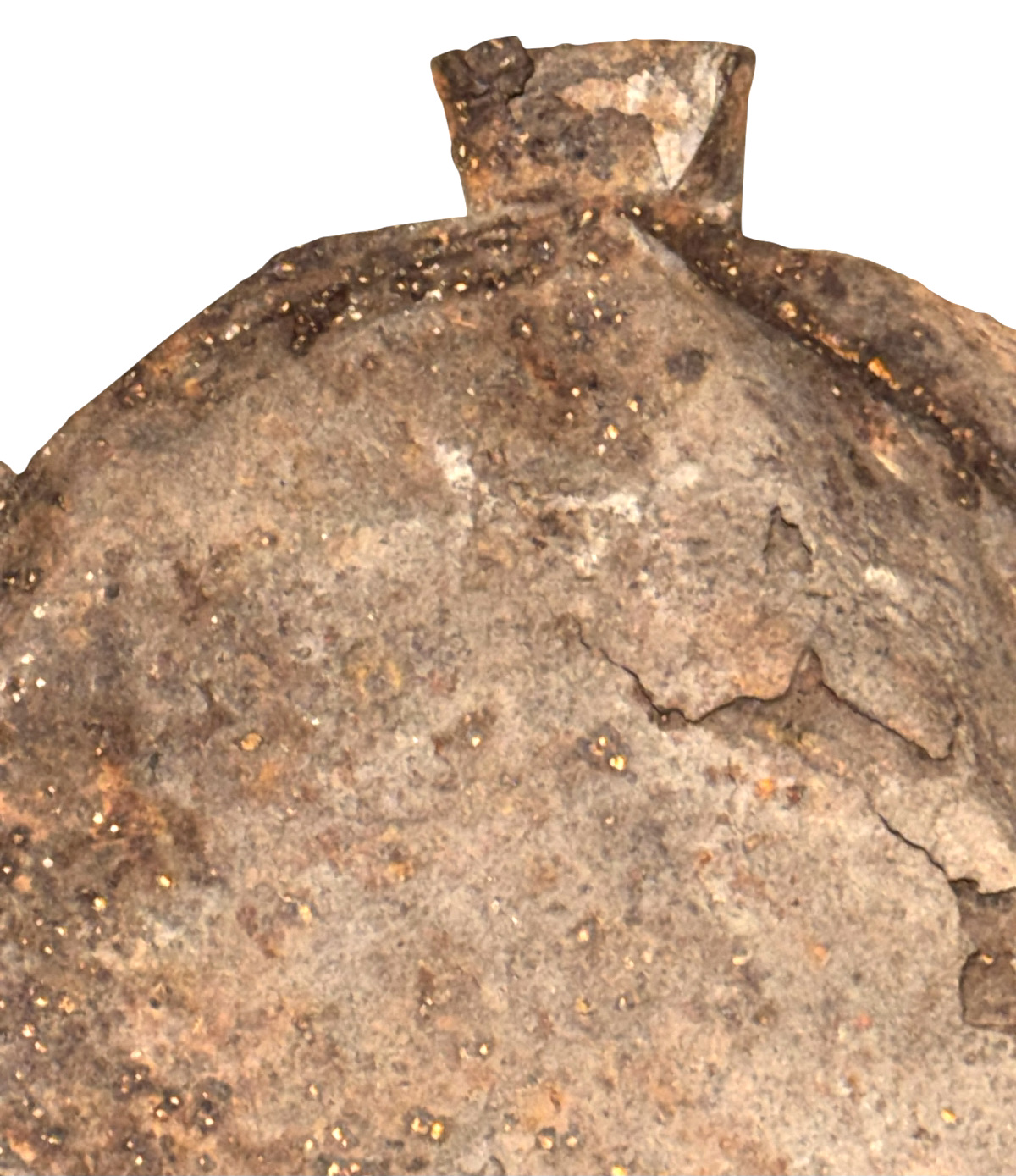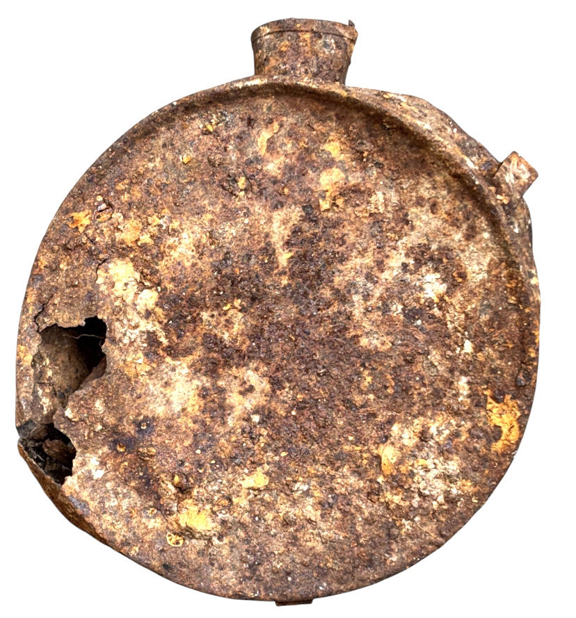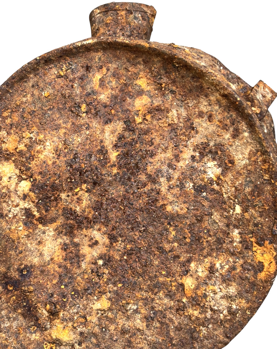 Dug Confederate Tin Drum Canteen – This rarely offered, Confederate tin drum canteen was an element in a long-time collector / digger’s collection that we recently obtained from his descendants. Although there is no provenance as to the location of the excavation of the canteen, it must have been in sandy, well-drained soil, as it remains in overall, good dug condition, with surface oxidation apparent, but only a relatively modest amount of significant deterioration; there is an obvious hole in one side of the canteen and a period damaged crease on the other side. The latter mentioned damage may have occurred during the period of use, thereby necessitating its original, soldier owner, to discard it. The spout and sling guides remain intact; the surface of the canteen has obvious oxidation, but is stable and relatively strong. We have had several dug, Federal canteens, but this is the first complete Confederate tin drum canteen that we have had.