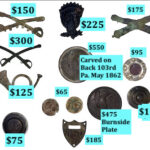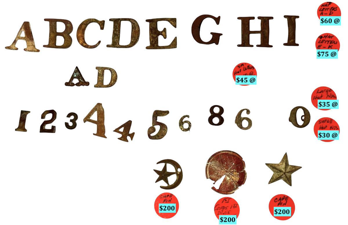 Group of Excavated Hat Letters and Numbers – We recently obtained a significant excavated collection that was assembled over a period of almost 50 years; amongst the impressive artifacts contained in this collection was this group of hat letters and numbers. The various letters and numbers remain, for the most part, in reasonably good condition. Please contact us with any questions.