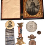 1865 Sketchbook with Hand Drawn Renditions of the Capture of New Orleans, the Battle Between the Monitor and Merrimac and the Battle of Gettysburg as well as Additional Period Street Scenes – This intriguing sketchbook is entitled, on the book’s marbled cover: “Esquisses Parisiennes 1866.” Contained in the book are several very well executed drawings, in pencil (some with tinting) of Paris street scenes and various mid-19th century, Paris inhabitants; additionally, there is a sketch of a shipboard dance on the “Queen”, with the date of September 29, 1866 written on the drawing, which was possibly done on the artist’s return trip to Europe from New York to Liverpool (***note research detailing the National Line ship “Queen”). Significantly, there are three or four sketches of Civil War battle tableaux to include: Gettysburg (somewhat limited in scope), the naval assault on New Orleans and a rather detailed drawing of the March 1862 encounter between the USS Monitor and the Confederate ironclad Virginia (Merrimac) – the latter shows the sinking of the Cumberland, as well as depictions of additional US Navy vessels and shoreline forts. Included in the back of the book is a handwritten explanation*** of the source of the Civil War engagement sketches – a group of Civil War miniature displays, sometimes called “dioramas” or “polyramas,” presented to the paying public, in the latter parts of the war and just after, to depict significant battles; an accompanying period written explanation, on pages in the back of the sketchbook, indicates that the tableaux sketched in the book, were displayed at the Hoboken, New Jersey Odd Fellows Hall – research indicates that an entity known as Goodwin & Woodward’s “Polyorama*** of the War” (a massive, minutely detailed panoramic and dioramic exhibition of Civil War battles – A traveling show advertised in 1864 featuring “prominent battles” and naval engagements) was a popular traveling show in New Jersey, in 1864. Although the book’s cover indicates that the drawings of Paris occurred in 1866, we presume that the artist was in America during the latter stages of the war and shortly thereafter returned to France aboard the “Queen”. The book and the sketches contained therein remain in overall good condition; this sketchbook is an exceedingly unique piece of Civil War artistic history, belying a rarely researched and related aspect of wartime civilian interest in what was occurring on the battlefield.