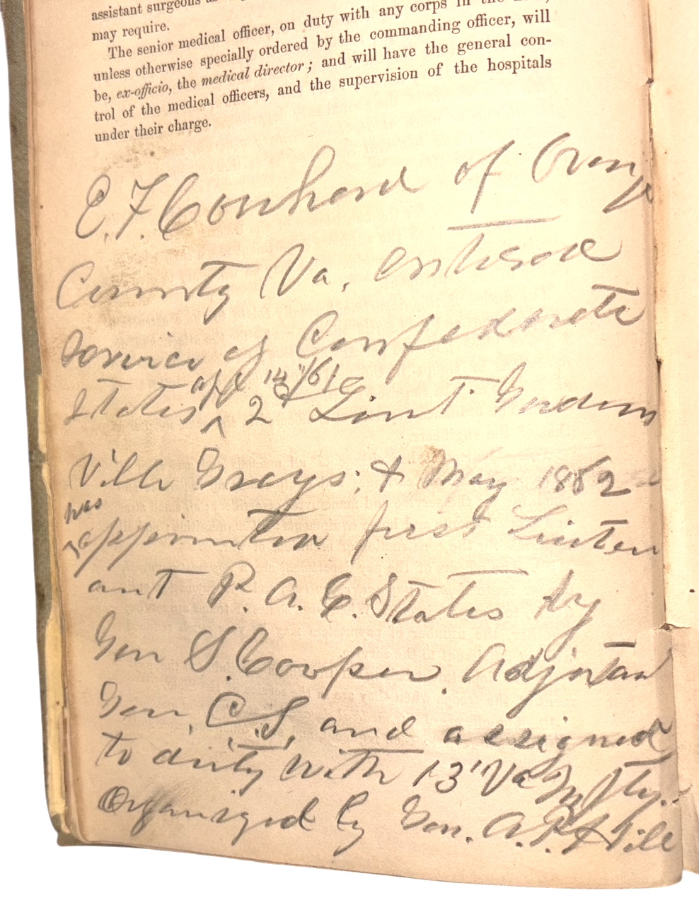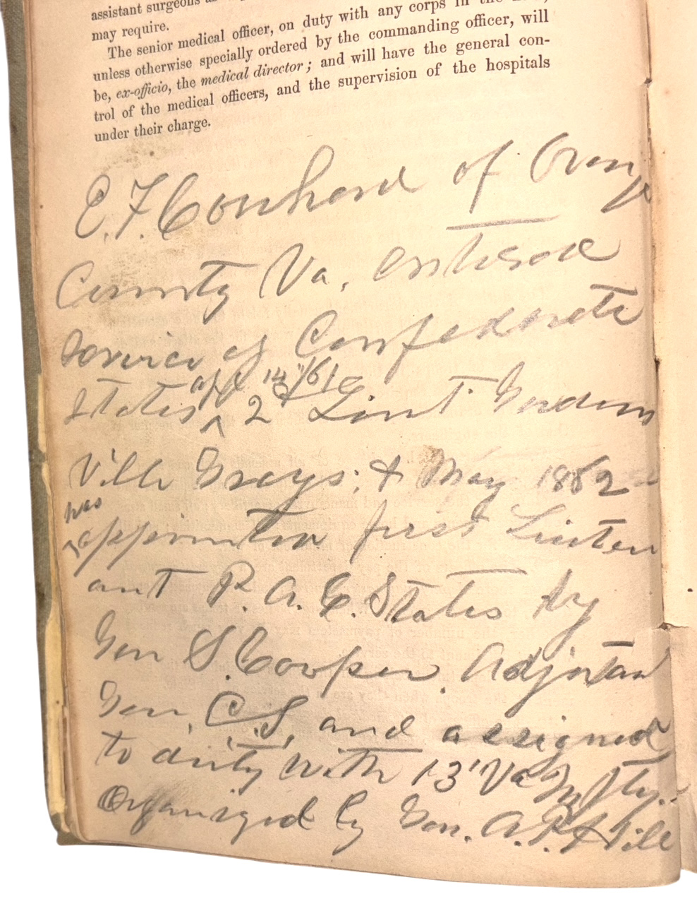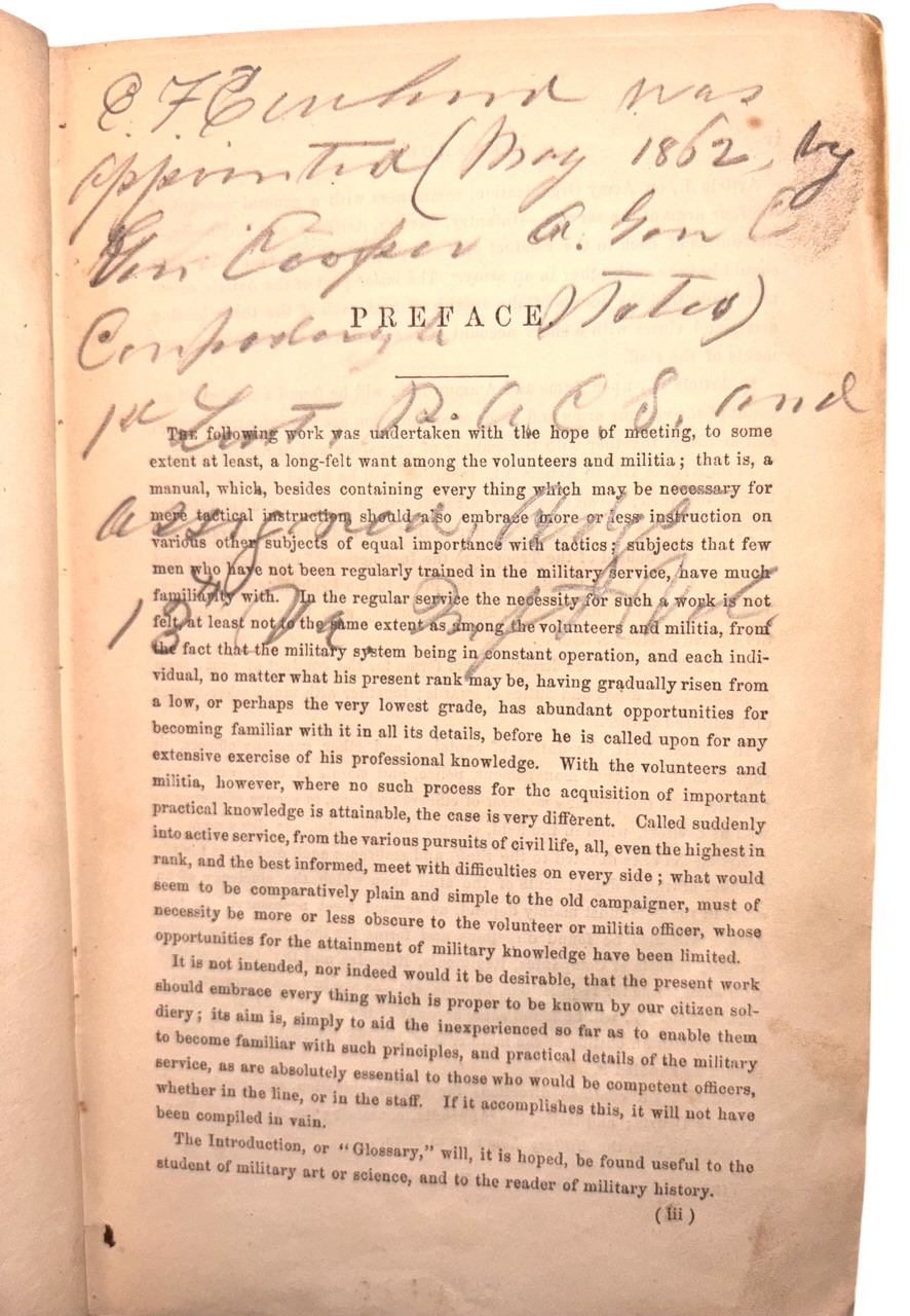 Id’d Confederate Officer’s Military Manual – “Manual of Instruction for the Volunteers and Militia of the United States” Major William Gilham, Published in 1861 – Inked and Written inside the Manual – 1st Lt. E.F. Cowherd Adj. 13th Va. Infantry – This well known, early war military manual is a comprehensive guidebook written by William Gilham, a colonel in the Confederate army during the American Civil War. The book was originally published in 1861 and was intended to provide guidance and instruction to the Confederate volunteers and militia who were fighting in the war. The book covers a wide range of topics related to military tactics and strategy, including the organization of troops, the use of firearms, and the construction of fortifications. It also includes detailed instructions on how to drill and train soldiers, as well as information on the proper care and maintenance of weapons and equipment. In addition to its practical advice, the Manual of Instruction also provides historical context and analysis of the military tactics used in previous wars, including the Napoleonic Wars and the American Revolution. The book is written in a clear and concise style, making it accessible to both experienced soldiers and those who are new to military service. As a result of John Brown’s raid on Harpers Ferry, Virginia Governor Henry Wise asked William Gilham to write a manual for the instruction of militia. Gilham, at the time, was a professor at the Virginia Military Institute, along with Thomas Jackson.  This specific example was published in 1861, just prior to the onset of the Civil War and Gilham’s entry into the Confederate Army.  In several areas of the beginning, frontispiece pages of the book is the name, inked and in pencil , of 1st Lt. F. S. Cowherd, adjutant of the 13th Va. Infantry; in the very back of the book is an old piece of paper with this penciled inscription: