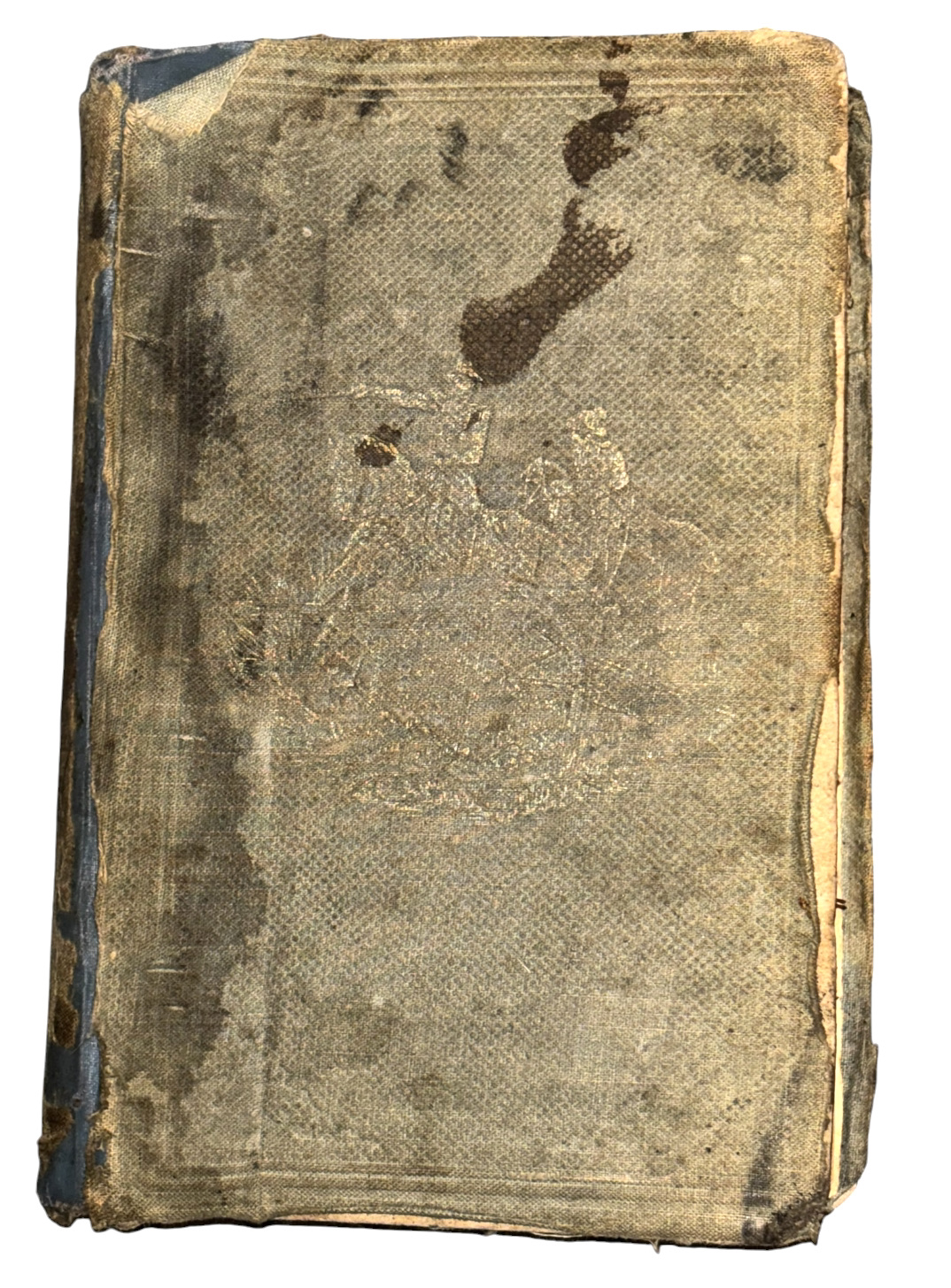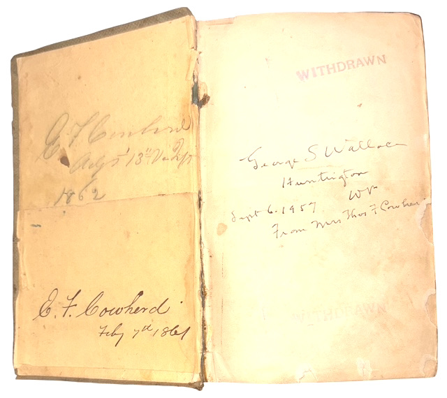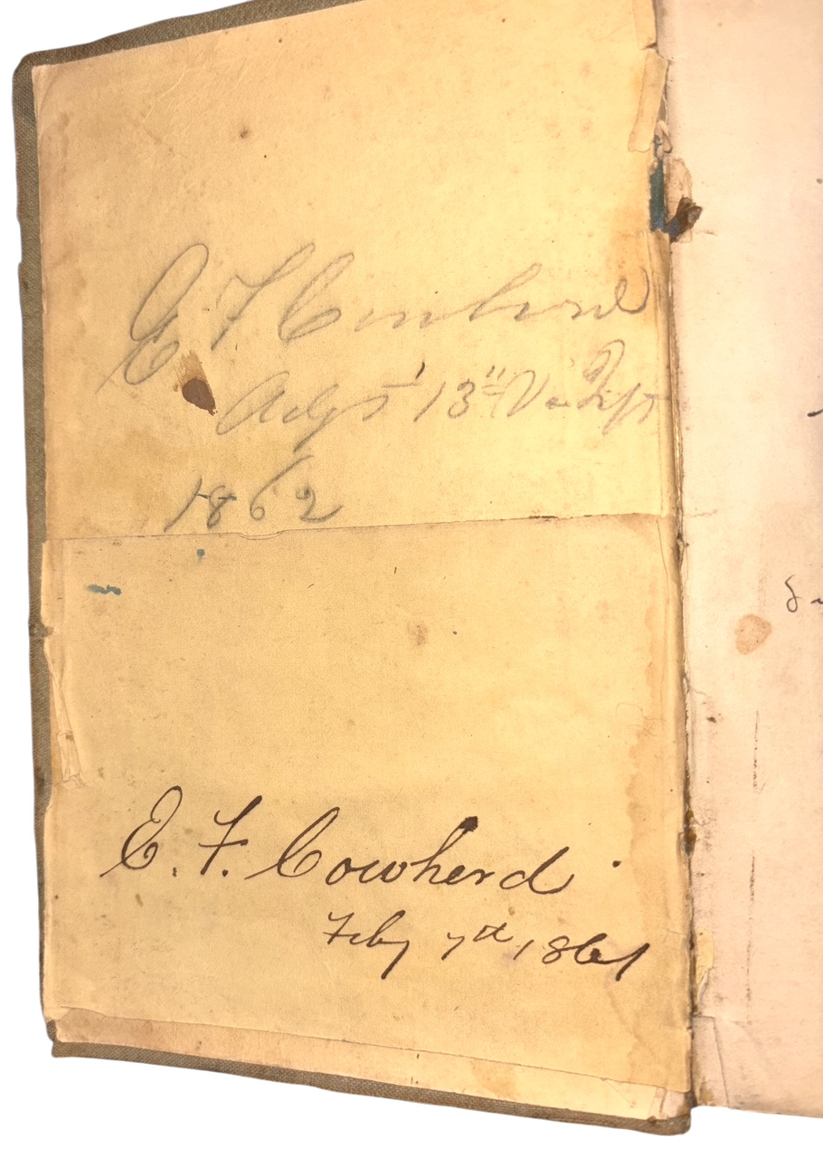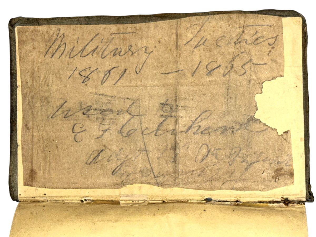 Id’d Confederate Officer’s Military Manual – “Manual of Instruction for the Volunteers and Militia of the United States” Major William Gilham, Published in 1861 – Inked and Written inside the Manual – 1st Lt. E.F. Cowherd Adj. 13th Va. Infantry – This well known, early war military manual is a comprehensive guidebook written by William Gilham, a colonel in the Confederate army during the American Civil War. The book was originally published in 1861 and was intended to provide guidance and instruction to the Confederate volunteers and militia who were fighting in the war. The book covers a wide range of topics related to military tactics and strategy, including the organization of troops, the use of firearms, and the construction of fortifications. It also includes detailed instructions on how to drill and train soldiers, as well as information on the proper care and maintenance of weapons and equipment. In addition to its practical advice, the Manual of Instruction also provides historical context and analysis of the military tactics used in previous wars, including the Napoleonic Wars and the American Revolution. The book is written in a clear and concise style, making it accessible to both experienced soldiers and those who are new to military service. As a result of John Brown’s raid on Harpers Ferry, Virginia Governor Henry Wise asked William Gilham to write a manual for the instruction of militia. Gilham, at the time, was a professor at the Virginia Military Institute, along with Thomas Jackson.  This specific example was published in 1861, just prior to the onset of the Civil War and Gilham’s entry into the Confederate Army.  In several areas of the beginning, frontispiece pages of the book is the name, inked and in pencil , of 1st Lt. F. S. Cowherd, adjutant of the 13th Va. Infantry; in the very back of the book is an old piece of paper with this penciled inscription: