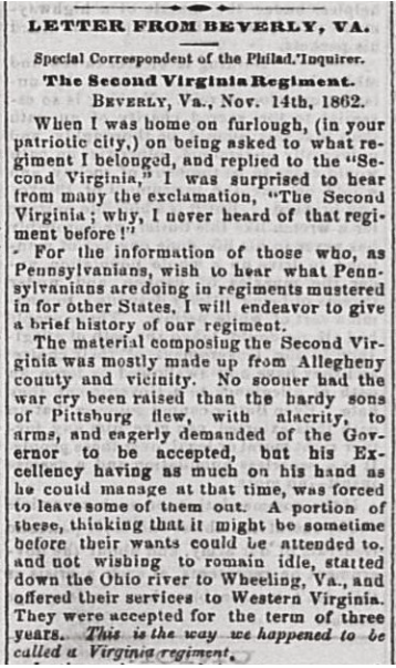 Article in the Wheeling Daily Intelligencer, November 24, 1862, describing how the regiment came to be formed