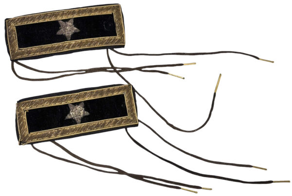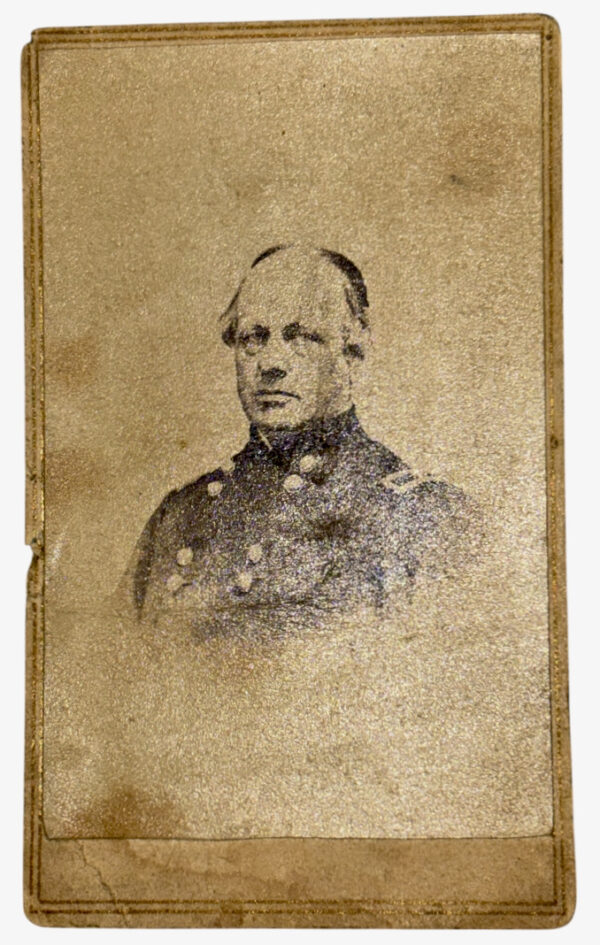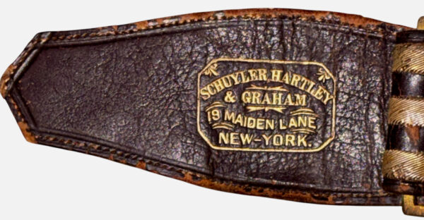 The address enumerated for Schuyler, Hartley & Graham is their war period New York address. The Brigadier General’s rank straps are constructed of single, gold bullion wire surrounding a silver bullion star, mounted on deep blue velvet; on the back of each strap, at each end, are a pair of “shoelace” style, tie downs, an early to mid-war feature. The CDV of Buckland is in fair condition, with some fading and a weak area along one side of the image.