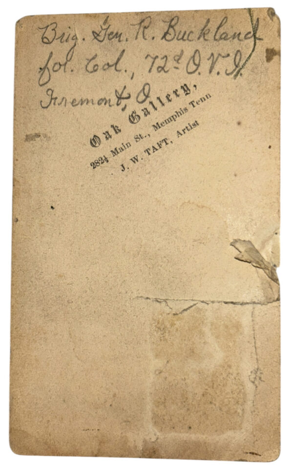 Ralph Pomeroy Buckland was a successful, 49-year-old lawyer in Fremont, Ohio, at the onset of the Civil War. He enlisted in October 1861, as a Colonel in the 72nd Ohio Infantry. For gallantry at the battle of Shiloh, where he commanded the 4th brigade of Sherman’s division, he was promoted brigadier-general of volunteers, Nov. 29, 1862. He commanded a brigade of the 15th army corps at Vicksburg and was later assigned to the command of the district of Memphis, and on March 13, 1865 and was brevetted major-general of volunteers. He resigned from the army in January, 1865, to accept a seat in Congress to which he had been elected while in the field. and was re-elected in 1866. He was president of the board of managers of the Ohio soldiers, and sailors, orphans, home from 1867 to 1873, and government director of the Union Pacific railroad from 1877 to 1880. Gen. Buckland was a delegate to the Philadelphia loyalists, convention in 1866, to the Pittsburg soldiers, convention, and to the Republican national convention of 1876. He died at Fremont, Ohio, May 28, 1892.