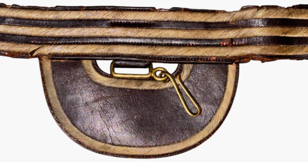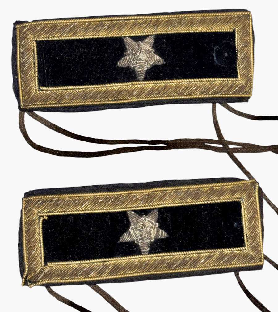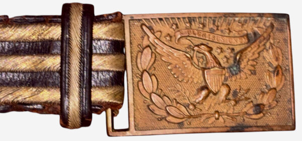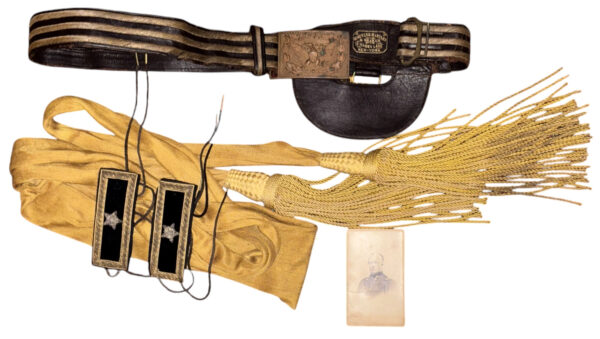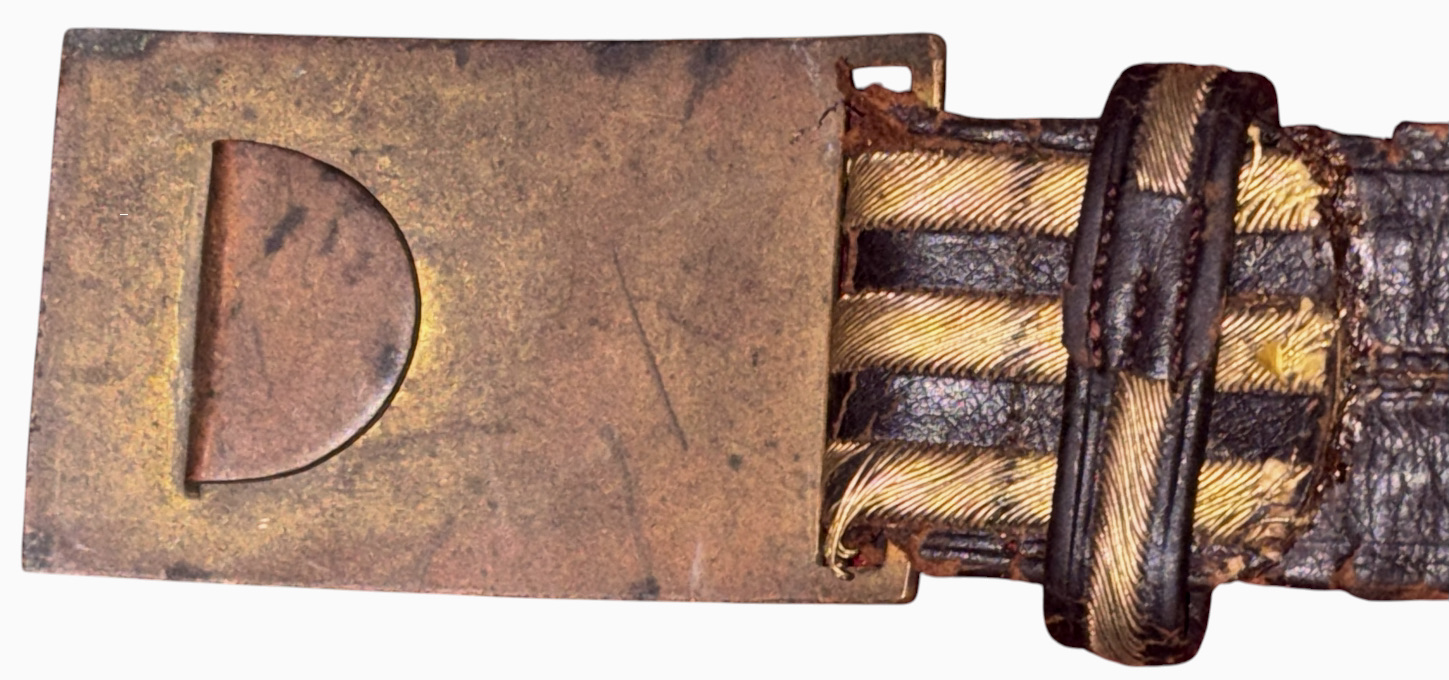 Id’d Brigadier General’s Sash, Dress Sword Belt, Early War Rank Straps and CDV – Brig. Gen. Ralph P. Buckland 72nd Ohio Infantry – This grouping provides a rare opportunity to obtain some uncommon Civil War militaria – a rare General’s sash; a custom made, dress officer’s belt by the famed wartime purveyor of military goods – Schuyler, Hartley & Graham; early war, tie-down style, Brigadier General rank straps. Included in the grouping is a period CDV of Gen. Buckland wearing his general’s frock coat and a period ID of the General, handwritten on the back. All of the components of this grouping remain in excellent condition. The sash is a bright yellow, silk example, with no weak areas or tears in the body of the sash; both knots and tassels remain in superb condition, as well. The belt is one of the finest that we have encountered – it is constructed of a fine grade of bridle leather exhibiting a black enameled finish on the exterior and interior sides of the belt; the belt is pleated, with alternating rows of twisted, gold bullion; there is a sword hanger safe and belt plate safe; the belt plate is a solid, cast brass M1851 Officer’s Eagle plate, that evidences traces of gilding; the belt plate safe has the following, gold embossed on it: