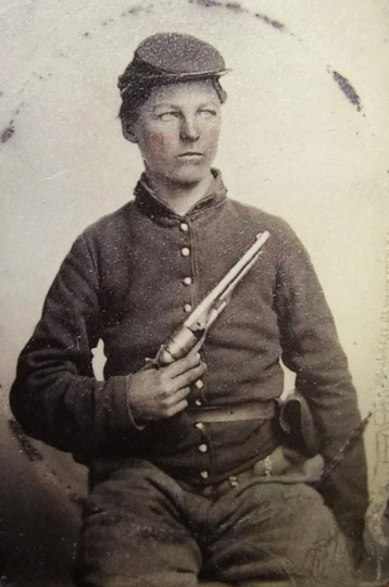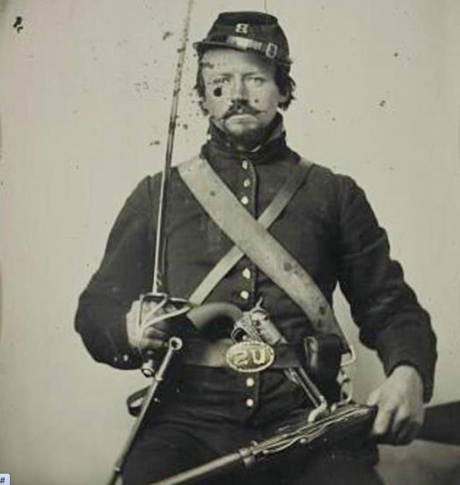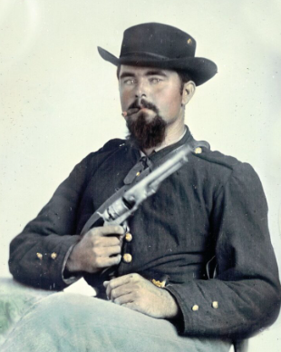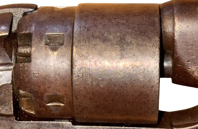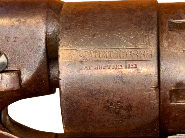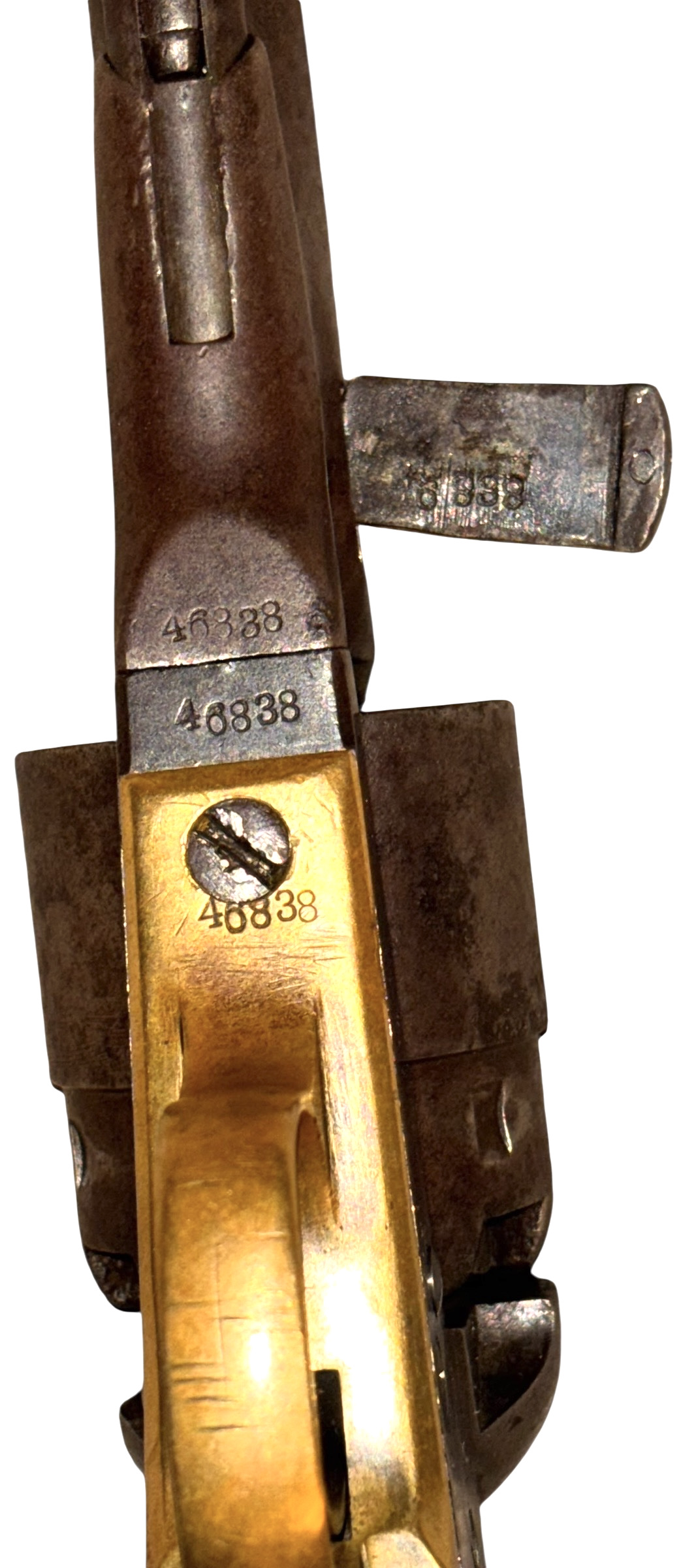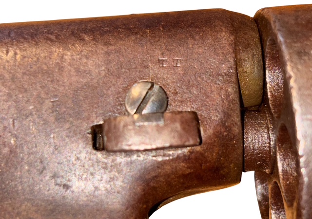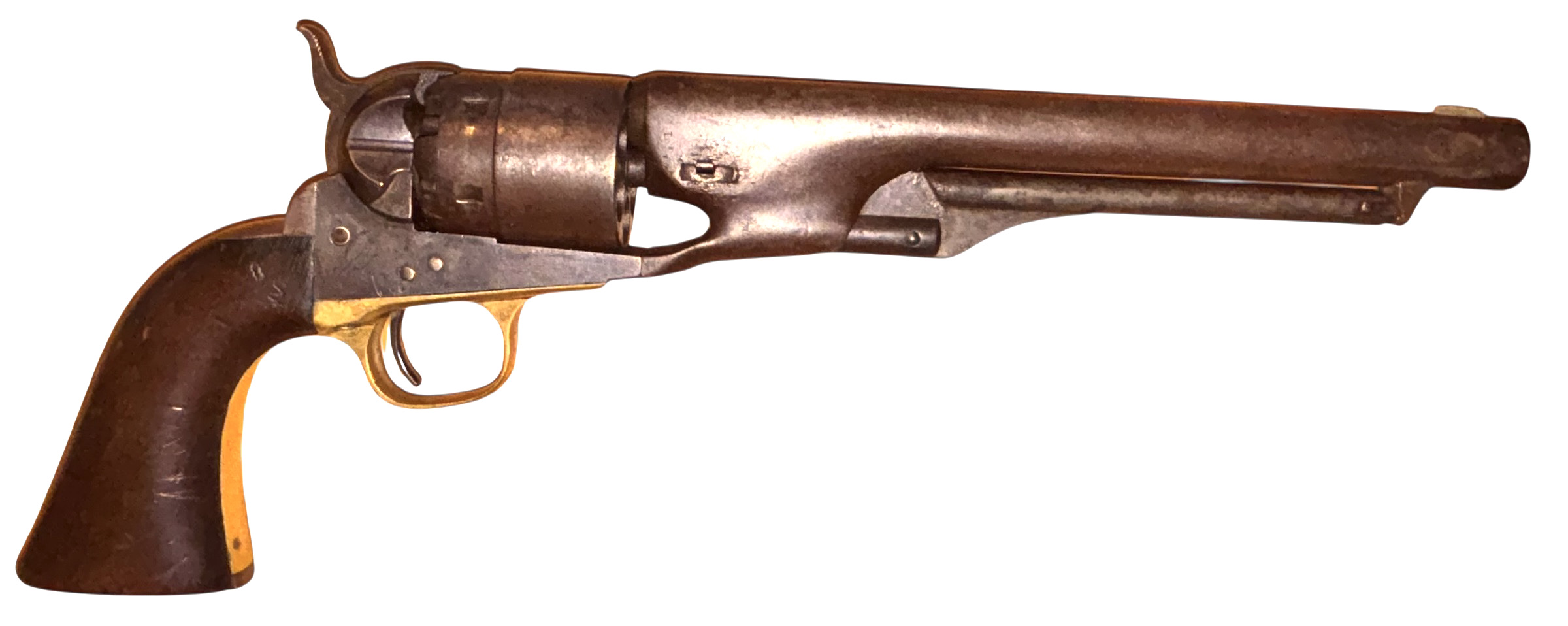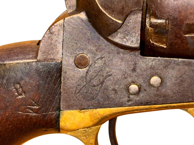 Civil War Period Colt Model 1860 Army Revolver – These 1860 Army revolvers were in production from 1860 through 1873, with a total of just over 200,000 pistols manufactured. This example has all matching serial numbers, to include the wedge and cylinder – 46,838 – indicating that the revolver was manufactured sometime in 1862. The pistol is .44 cal. and has a six-shot, rebated cylinder, with the longer 8” barrel (indicative of an early production revolver); the barrel is round with a creeping style loading lever. The grips are one-piece walnut; this revolver was issued to the U.S. military, as there is a government inspector’s cartouche on the lower area of the right grip and additional sub-inspector’s initials on several of the metallic components of the revolver, as well. There are two letter “W”s carved in the grips and an unusual script large letter “G” stamped in the right frame. The frame, hammer and loading lever are casehardened, with a trace remaining; the trigger guard is brass and the backstrap is blued steel. On the top of the barrel is stamped: