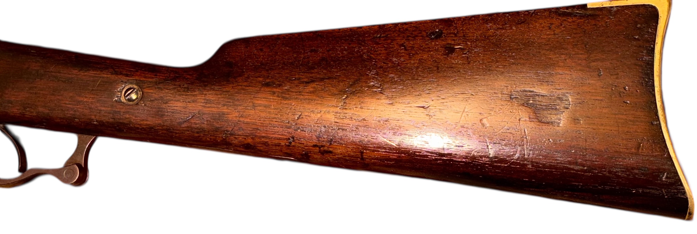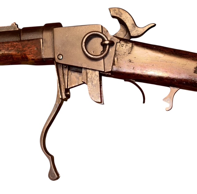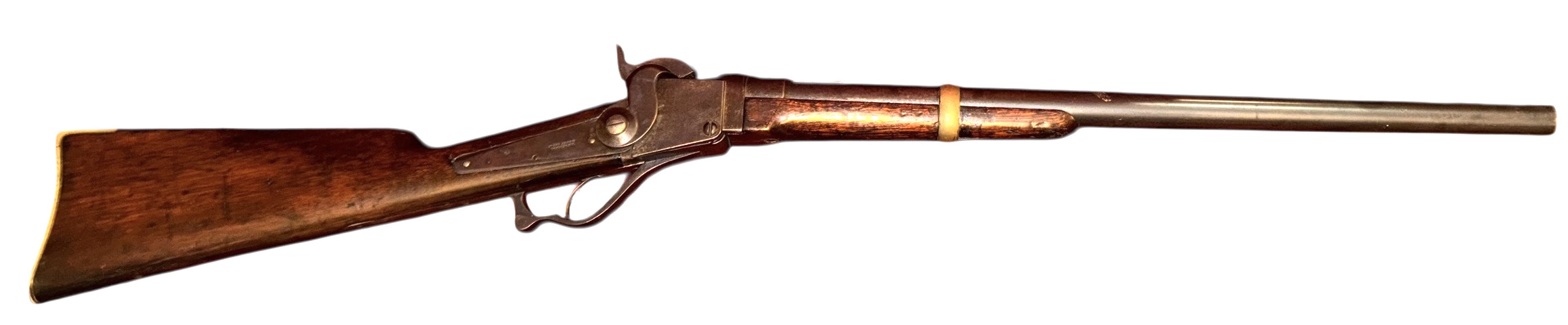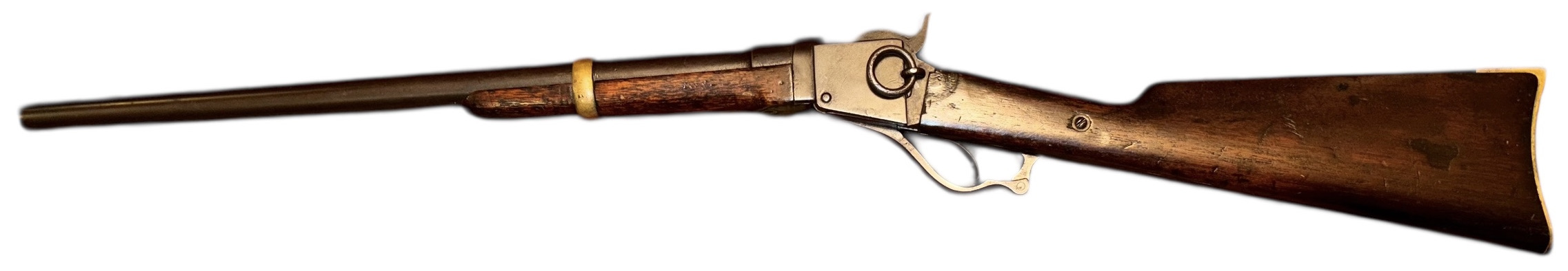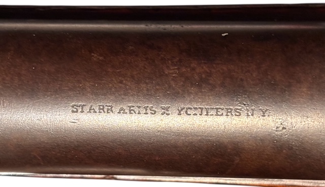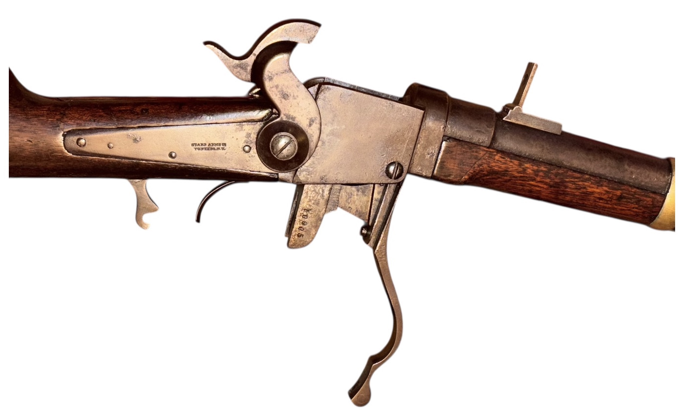 Civil War Period Starr Percussion Carbine – This Starr carbine is an excellent example of a Civil War period carbine for which the Federal Government contracted just slightly over 20,000, mid-war; by 1863, shipments of the Starr carbines were starting to be delivered, with the balance of the shipment completed by August of 1864. The serial number, which is stamped in the breech block, appears to be 18,985, indicative of one of the latter group of carbines delivered to the government. These carbines were breechloading, .54 caliber weapons, which operated as single shot firearms, with a combination trigger guard and lever that dropped the breechblock for chambering a round. This carbine is in overall very good condition – it retains a considerable amount of original bluing on the barrel and some casehardening on the receiver and lock; both brass elements – the butt plate and barrel band – remain in excellent condition with pleasing aged patinas; the walnut butt stock and fore stock’s finish remains in excellent condition with only some very minor period use blemishes; the firing action is strong; both sights remain; the bore has a considerable amount of rifling remaining. All of the correct markings are readily visible: the barrel, in front of the rear sight, is stamped: “STARR ARMS CO. YONKERS, N.Y.”; the upper tang of the receiver is stamped: “STARR’S PATENT / SEPT. 14TH 1858”; single letter sub-inspector stamps appear on various parts of the carbine. Starr carbines would see service with these Union cavalry regiments: 24th NY, 11th Missouri, 5th Kansas and the 1st Arkansas. The inventor of these carbines and Starr pistols, both used during the Civil War, was Ebeneezer Starr, son of famed gunmaker Nathan Starr, Jr. During war period government tests, Federal agents rated the Starr as better than the Sharps carbine.
