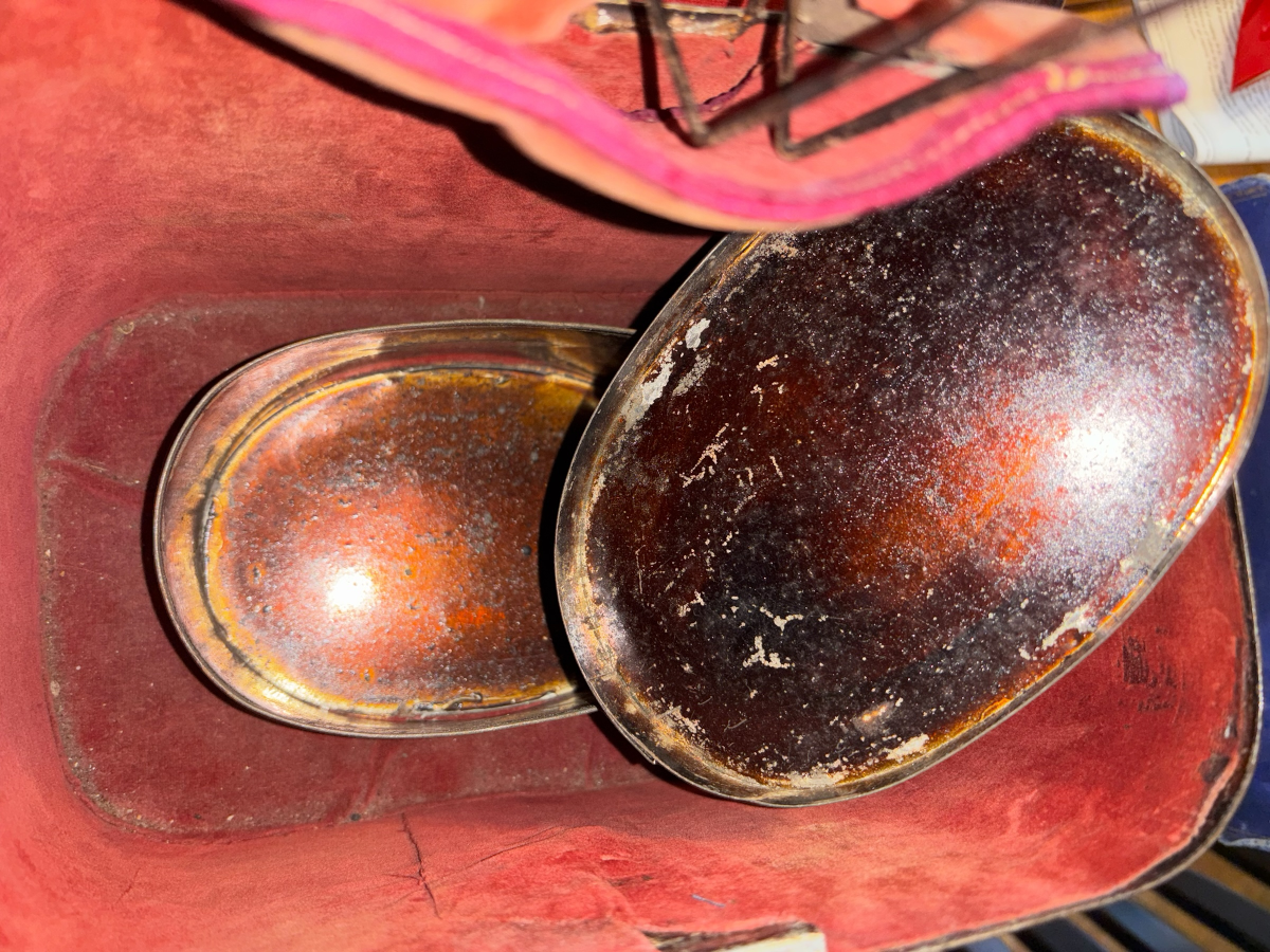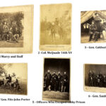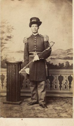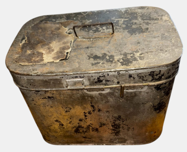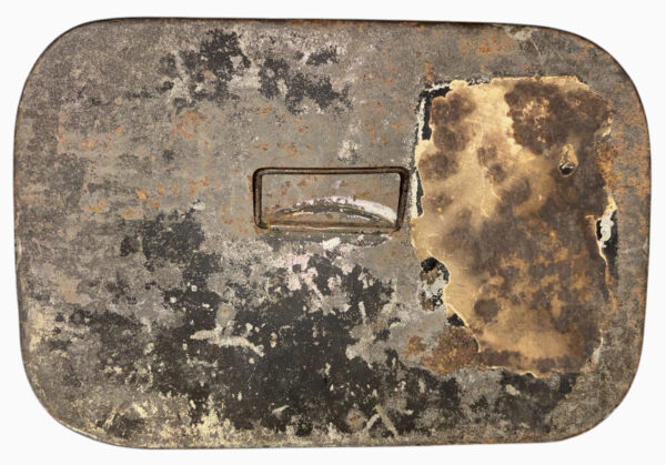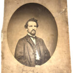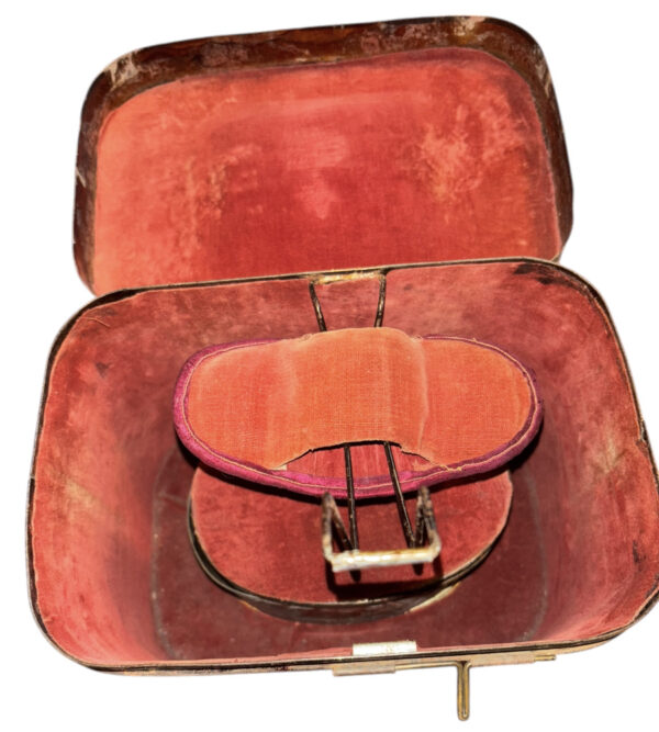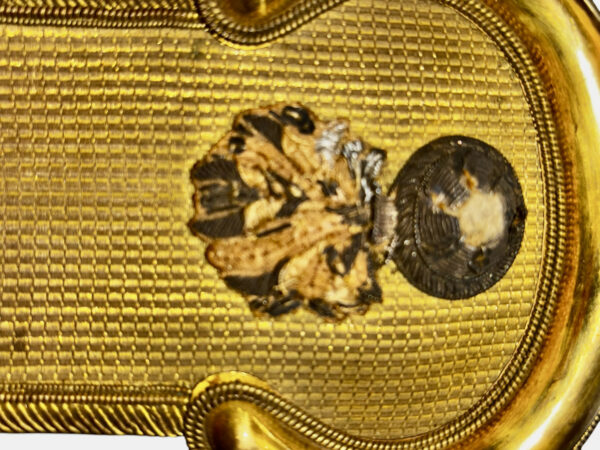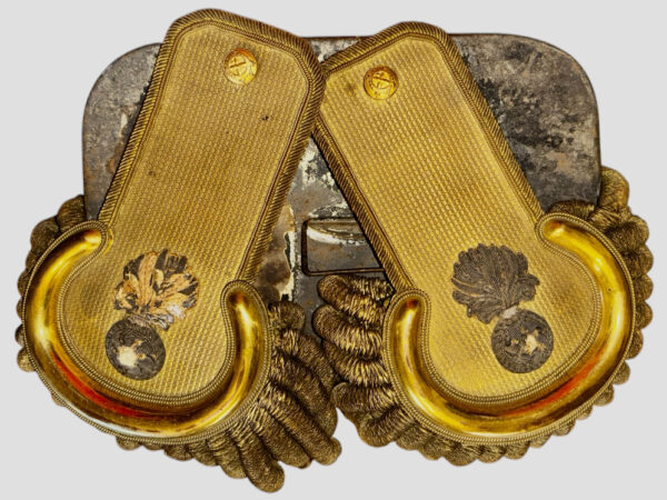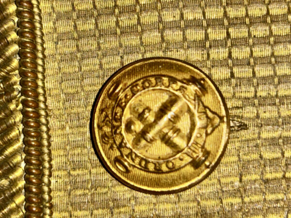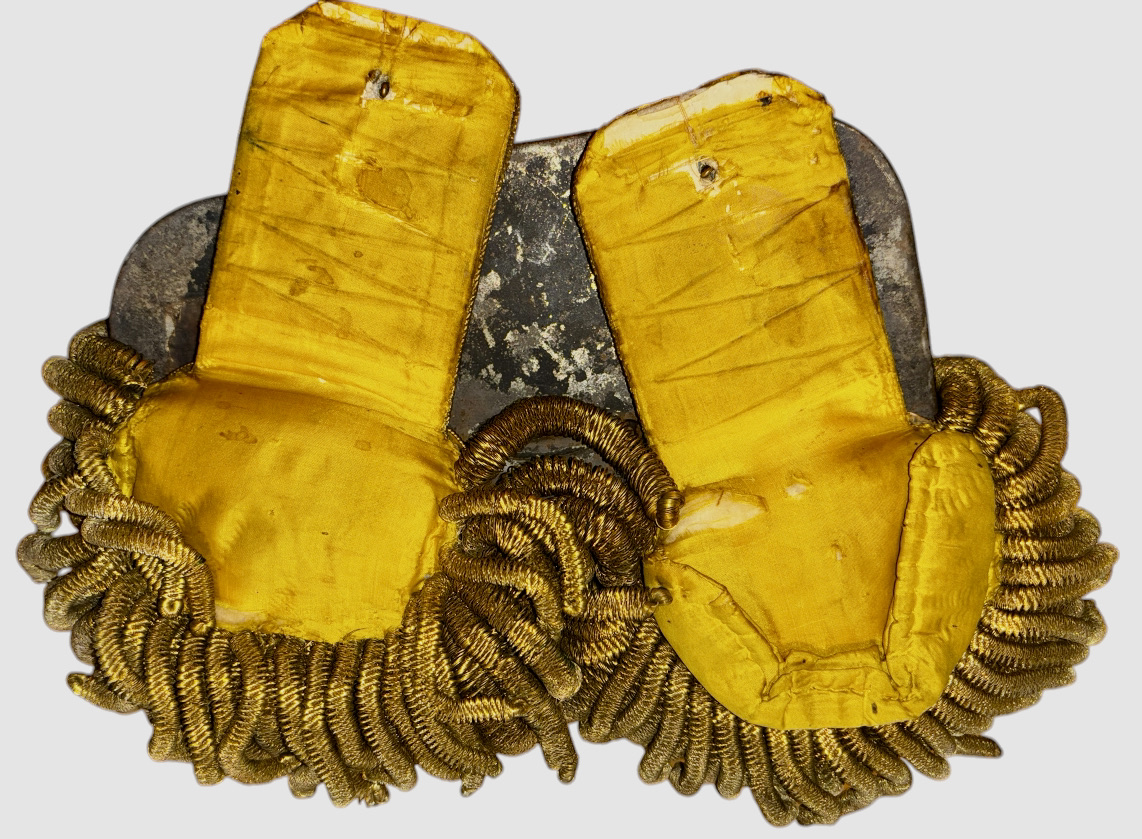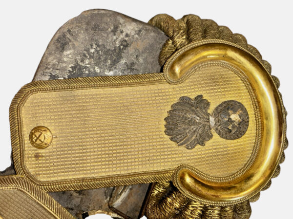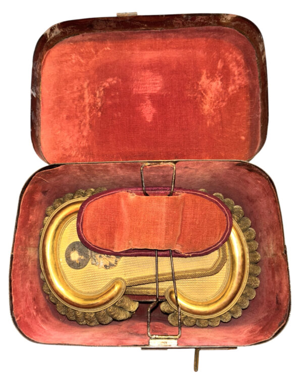 Civil War U.S. Ordnance Officer’s Dress Epaulettes in Original Jappaned Tin Case – We have had many Civil War officers’ dress epaulettes, although this is the first pair of Ordnance officer dress epaulettes that we have had or seen. This set, still housed in its original, jappaned, tin case that retains its period, red velvet lining, is embellished by gold bullion edging around the rectangular shoulder areas and gilded brass crescents at either end; coiled, gold bullion wire drops hang below each of these crescents. At each far end of the epaulettes is a rare, Civil War period, Ordnance officer cuff button; at the wider end, inside of each crescent, is a silver bullion, Ordnance bomb insignia – one of these bombs remains in very good condition, while the other has some very noticeable bullion loss. The underside of each epaulette is covered with a fine grade of yellow silk, overlaying cotton padding; the shanks of each Ordnance cuff button is visible. As mentioned, the interior of the tin case is lined in red velvet, which remains in excellent condition. Additionally, the padded, red velvet retaining device is also present – it is hinged and can be opened to retrieve the epaulettes, when they were needed for wear by an officer. Mounted inside the interior, bottom of the case is a red velvet covered, jappaned compartment, now empty, for an officer to place any additional insignia. The exterior of the case retains about 50% of its original jappaning and has what appears to be an old paper label, which is now unreadable. These cased epaulettes are a rarely encountered set and were worn by an officer in a most important branch of the Federal army, either during or just prior to the Civil War.