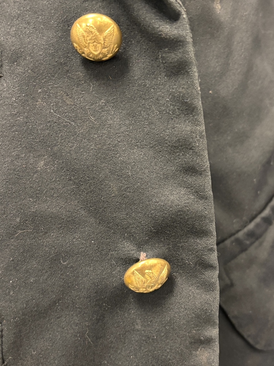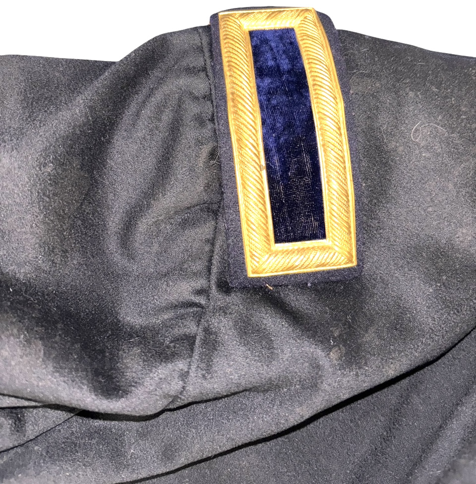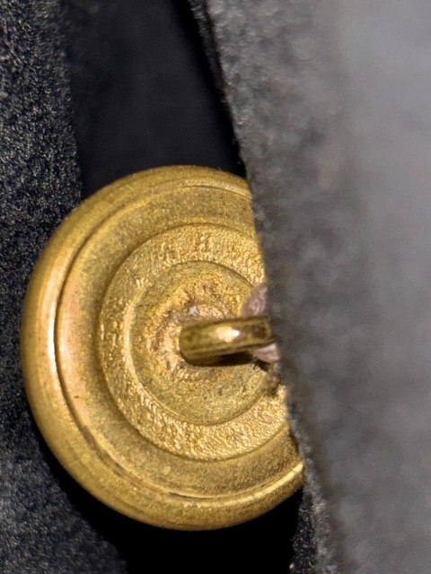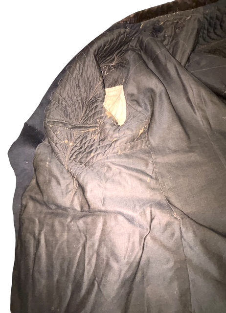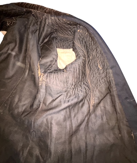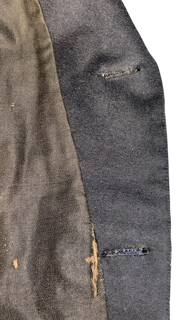 Civil War Union 2nd Lieutenant of the Infantry Fatigue Blouse or Sack Coat ā This rare coat remains in superb condition; the fine, English broadcloth wool retains its period, deep blue color and exhibits little to no insect damage. The coat exhibits the work of a superior tailor, indicative of it being a custom-tailored textile ā there is considerable hand work, to include the finely quilted lining, the sleeve linings, the dark velvet collar and the tacking on the underside of the collar and lapels. The coat exhibits the following, war period characteristics: wide or āballoonā elbows, considerable (as mentioned) hand work, hand-whipped and corded buttonholes, fine cotton, striped (even width stripes) sleeve lining, Smithās Patent 2nd Lt. of the infantry shoulder straps, dark satinette quilted padded lining, polished print cotton lining interior and exterior pockets, āgatheredā shoulder construction. The front panels are curved at the left and right bottoms. This coat features an unusual three-button front, with two buttons on the back waist / hip area ā all of the buttons are Eagle I officer buttons with RMDC pre-war, Horstmann back marks; there are two Eagle I, non-functional cuff buttons on the cuffs, all exhibiting war period, āExtra Qualityā back marks. The coat has two front, exterior, flap covered, larger pockets, with an upper left small pocket, combined with a mid-right, small crescent-shaped watch pocket ā all are lined with a fine cotton print material. The interior of the coat exhibits one vest pocket, also lined with the same unusual cotton print.