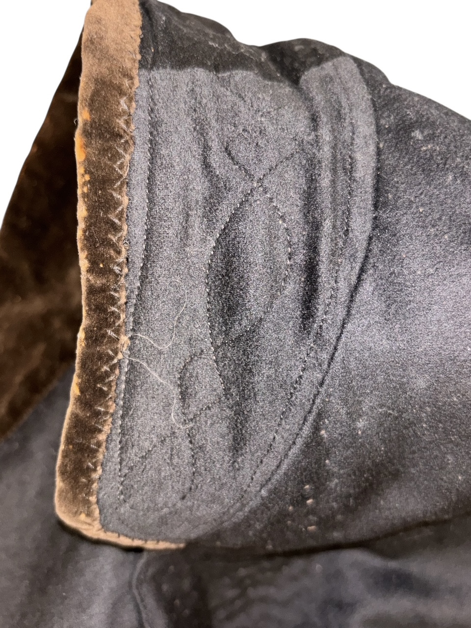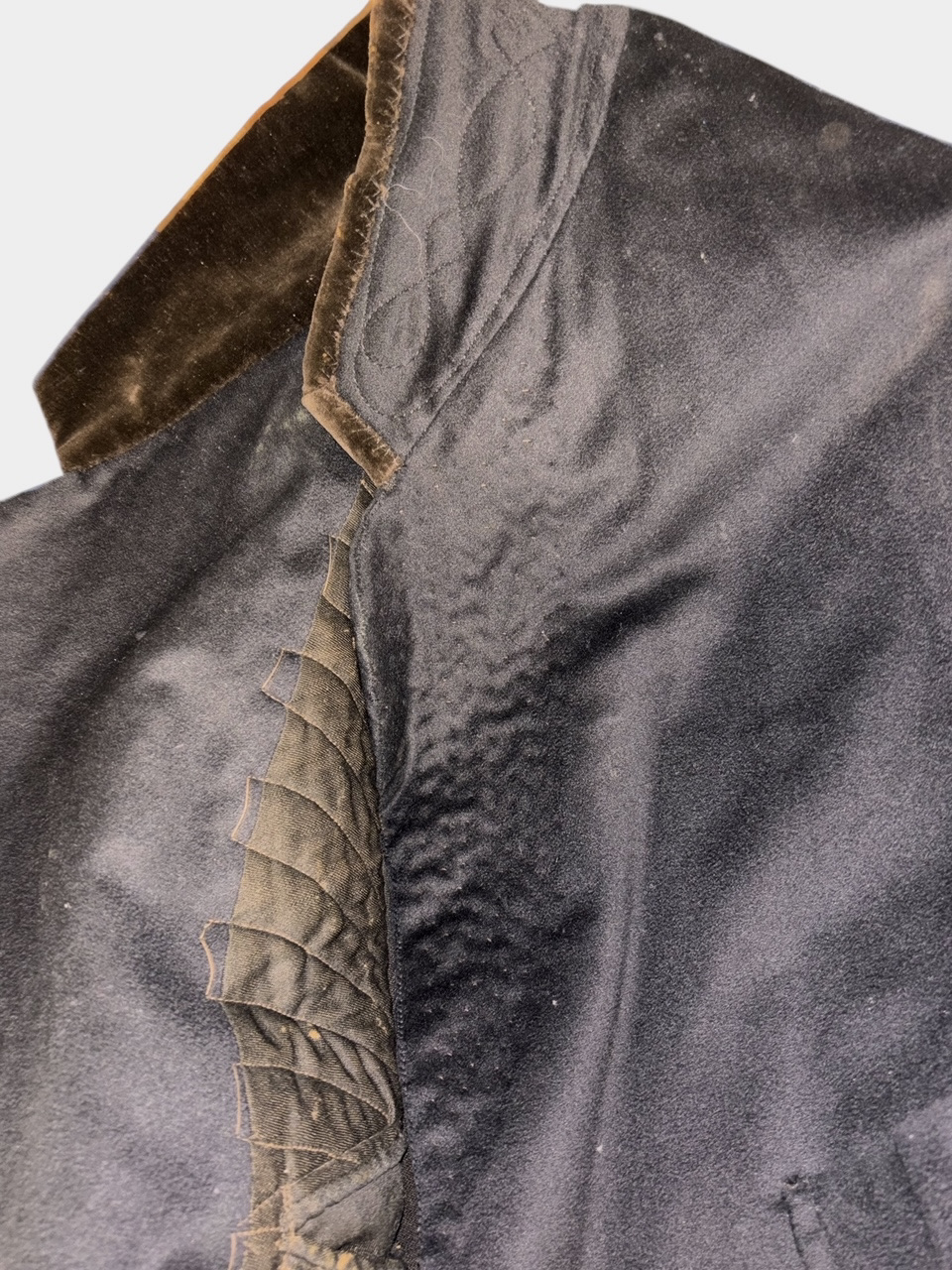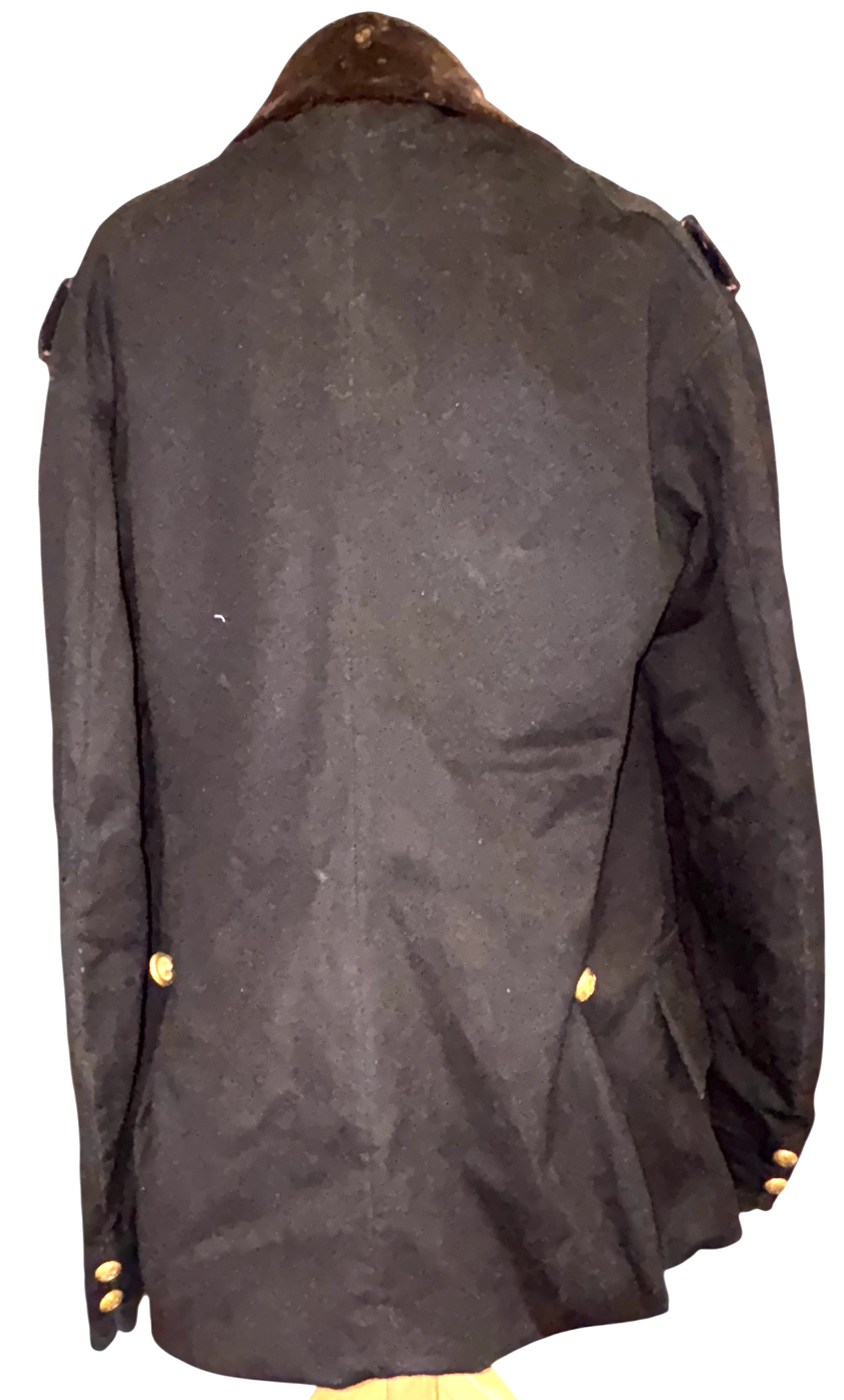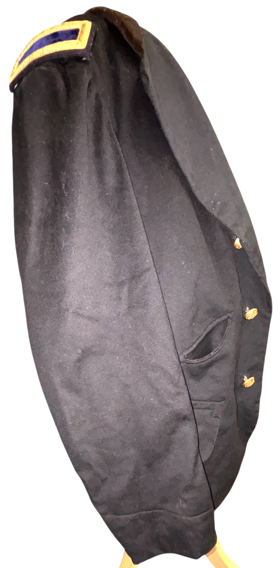 Civil War Union 2nd Lieutenant of the Infantry Fatigue Blouse or Sack Coat ā This rare coat remains in superb condition; the fine, English broadcloth wool retains its period, deep blue color and exhibits little to no insect damage. The coat exhibits the work of a superior tailor, indicative of it being a custom-tailored textile ā there is considerable hand work, to include the finely quilted lining, the sleeve linings, the dark velvet collar and the tacking on the underside of the collar and lapels. The coat exhibits the following, war period characteristics: wide or āballoonā elbows, considerable (as mentioned) hand work, hand-whipped and corded buttonholes, fine cotton, striped (even width stripes) sleeve lining, Smithās Patent 2nd Lt. of the infantry shoulder straps, dark satinette quilted padded lining, polished print cotton lining interior and exterior pockets, āgatheredā shoulder construction. The front panels are curved at the left and right bottoms. This coat features an unusual three-button front, with two buttons on the back waist / hip area ā all of the buttons are Eagle I officer buttons with RMDC pre-war, Horstmann back marks; there are two Eagle I, non-functional cuff buttons on the cuffs, all exhibiting war period, āExtra Qualityā back marks. The coat has two front, exterior, flap covered, larger pockets, with an upper left small pocket, combined with a mid-right, small crescent-shaped watch pocket ā all are lined with a fine cotton print material. The interior of the coat exhibits one vest pocket, also lined with the same unusual cotton print.