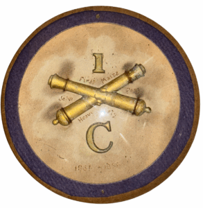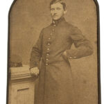 Civil War Union Cavalry Officer’s Buff Colored Wool Vest – We have had several Civil War, army vests, although they have always been somewhat difficult to find; we have had several dark, blue wool vests and some white linen vests, but this vest is one of the first we have had or seen that is constructed of a fine, low matte, buff-colored wool. The front of the vest is wool, while the lining and back are constructed of a high grade of linen. There are nine, Eagle “C’ cuff size buttons, affixed to the front of the vest via “bachelor rings”; all of the button holes are hand-whipped. The back of the vest has its original size adjuster straps, joined by brass clasps (unmarked). The vest has three, front pockets – two on one side of the front and one on the other, indicative of a Civil War period vest. The collar is a layover type. The vest was constructed via a combination of treadle machine and hand work. The vest remains in very good condition, with some wear staining visible on the linen back.