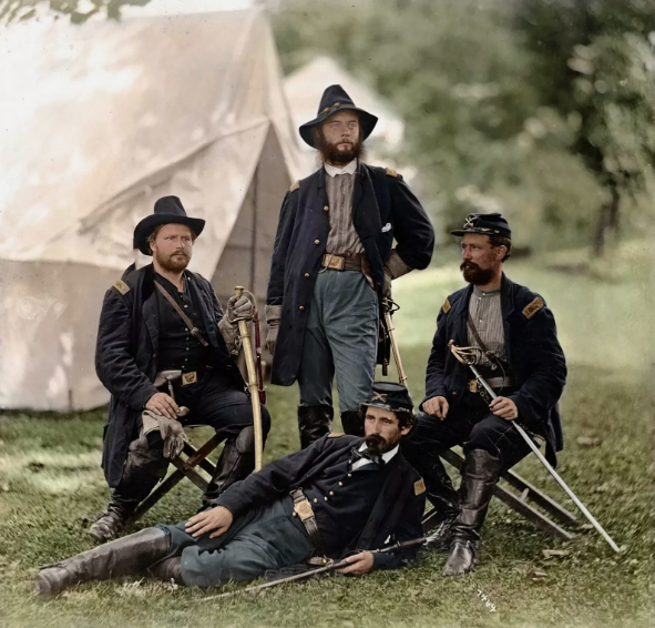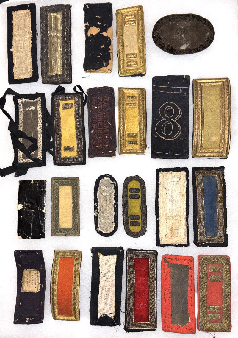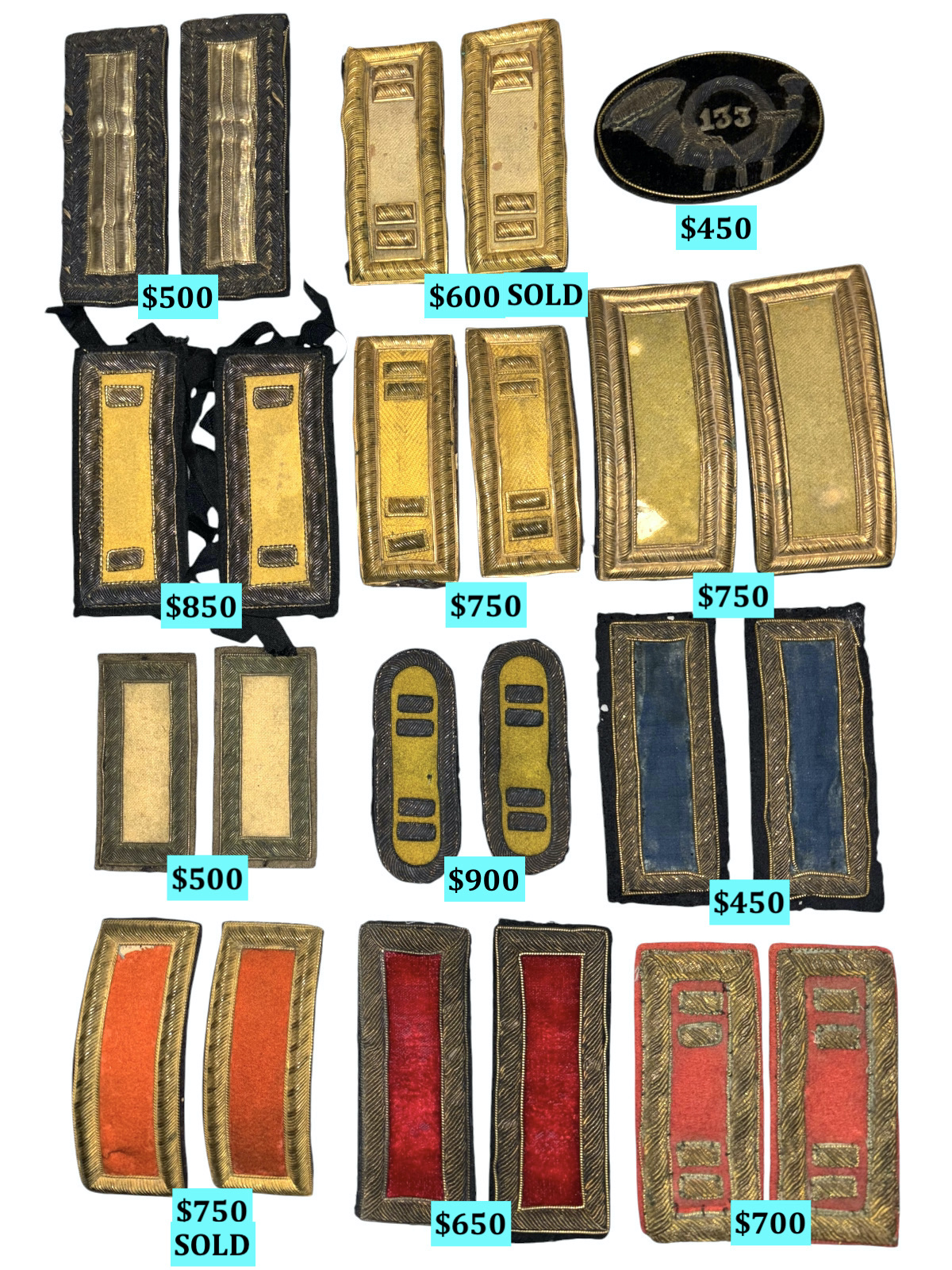 Collection of Civil War Union Officers’ Rank Straps – This group of high quality, Union officers’ rank straps was part of a large insignia collection maintained by a long time collector; we recently obtained most of this collection. Please look at both sets of photographs of the straps – the first set of images shows all of the straps’ topside views; the second set of images shows the underside of one of each of the pair of straps; note that some are Smith’s Patent straps, with appropriate markings. Each strap is priced. Please contact us with any questions. Note that prices are enumerated beneath each pair of straps.