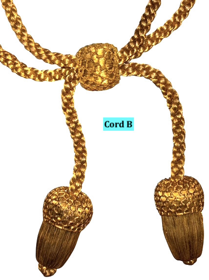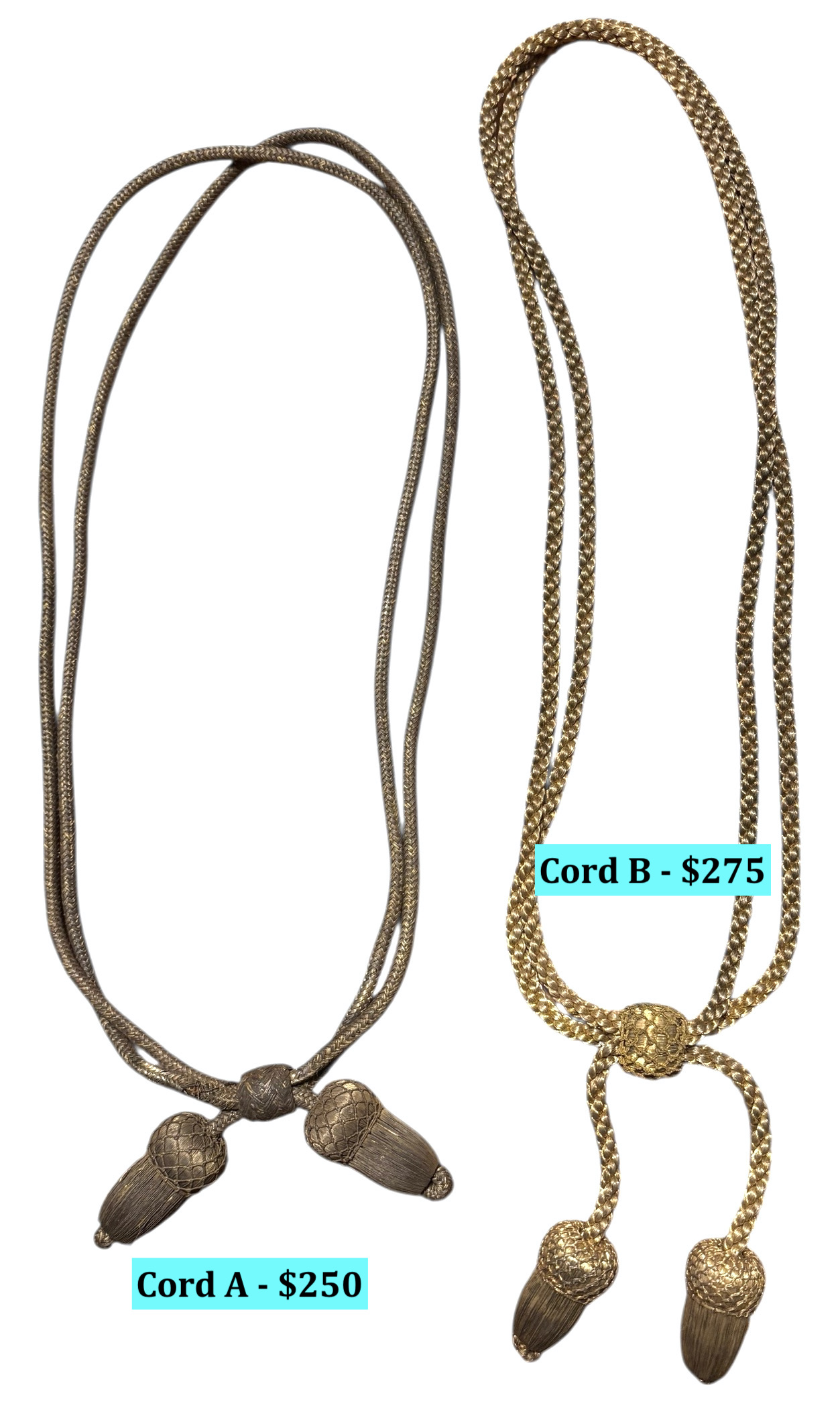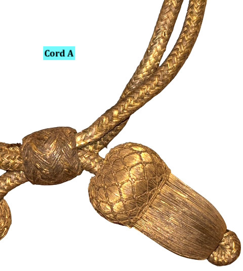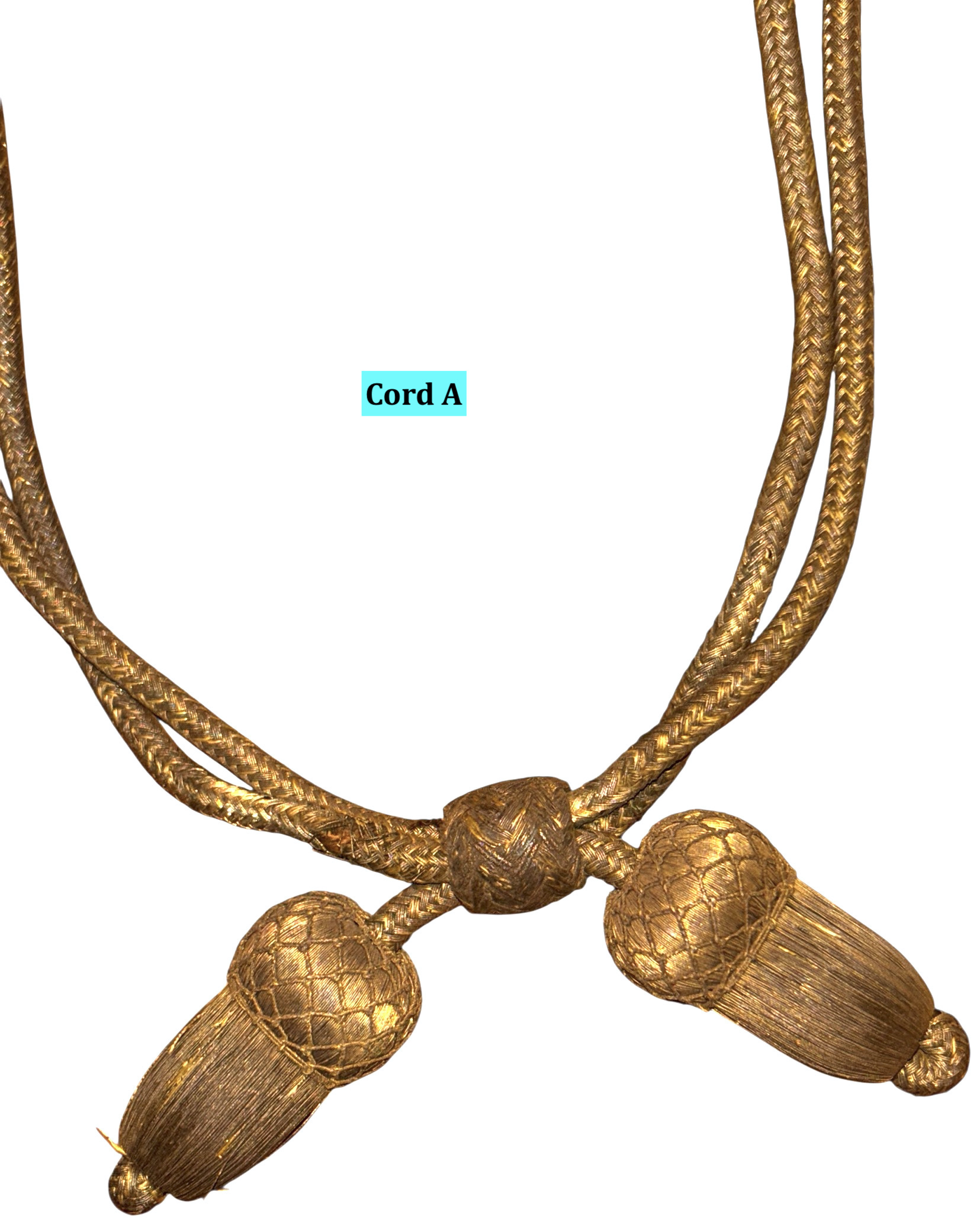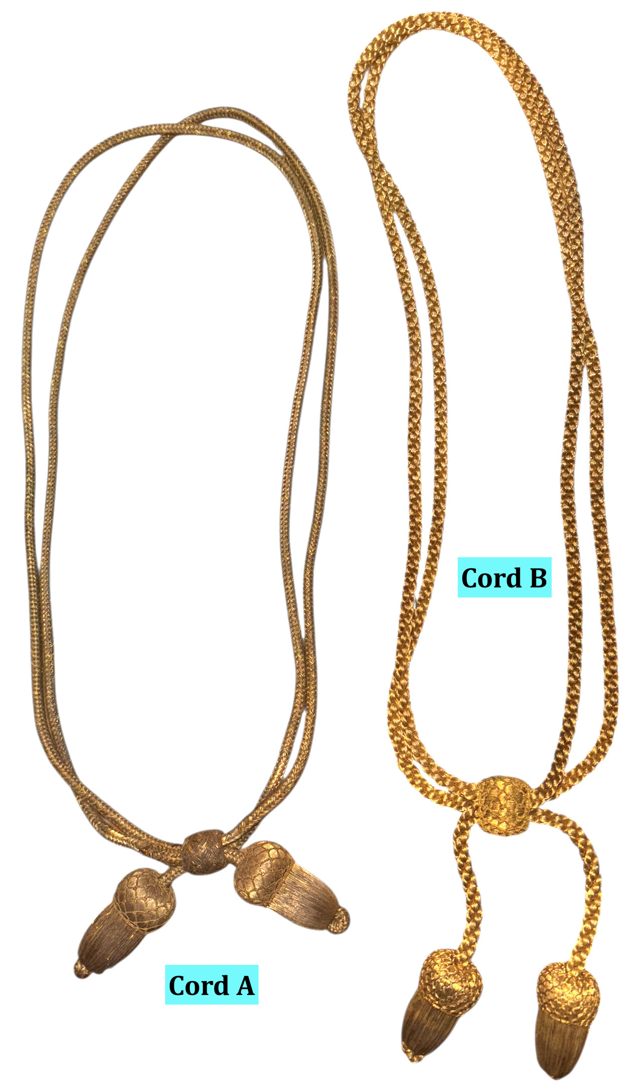 General Officer’s Hat Cords – Indian War Period to Spanish-American War – These regulation, general officer’s hat cords were designed for use on a campaign hat; the regulations stipulated that the cords were to be constructed of solid gold bullion thread. The acorn tassels and cording are characteristic for the period of the late 1870s to the 1890s. Both sets of cords remain in nearly unused condition, with little to no noticeable areas of fraying; the color of both cords remains vivid and not faded; the netting around the acorn shells and center slide remains in excellent condition. These are the first of these rarely found General officer cords from this time period that we have had. Price per cord is enumerated on the photo of the cords.