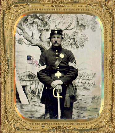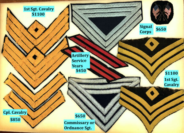 Group of Rare Civil War NCO Chevrons – This group of original, Civil War period, Union enlisted men’s rank chevrons, all remain in overall very good condition. Included in the group of chevrons are one pair of Civil War, artillery years of service stripes and a rare, war period Signal Corps, embroidered hat badge. Prices are enumerated per item.