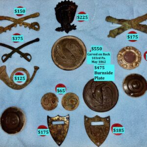 Excavated M1826 Civil War Eagle Breastplate with 103rd Pennsylvania Vol. Infantry Carved in the Back of the Plate by the War Period Soldier Owner of the Plate$500Excavated M1826 Civil War Eagle Breastplate with 103rd Pennsylvania Vol. Infantry Carved in the Back of the Plate by the War Period Soldier Owner of the PlateOctober 18, 2025
