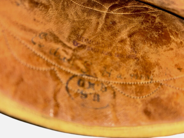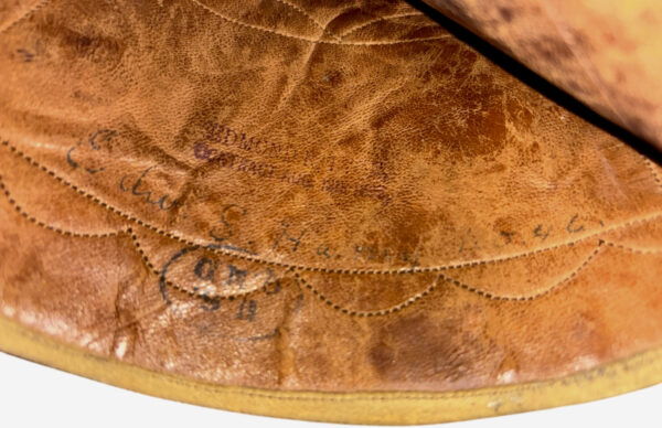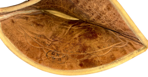 Additionally, the name of the contracted manufacturer of the gauntlets is stamped in the same area as the above stamping and written soldier’s name; the contractor’s name is difficult to discern, as is the date of manufacture. The gauntlets size – “91/2” is also stamped above the inked name.