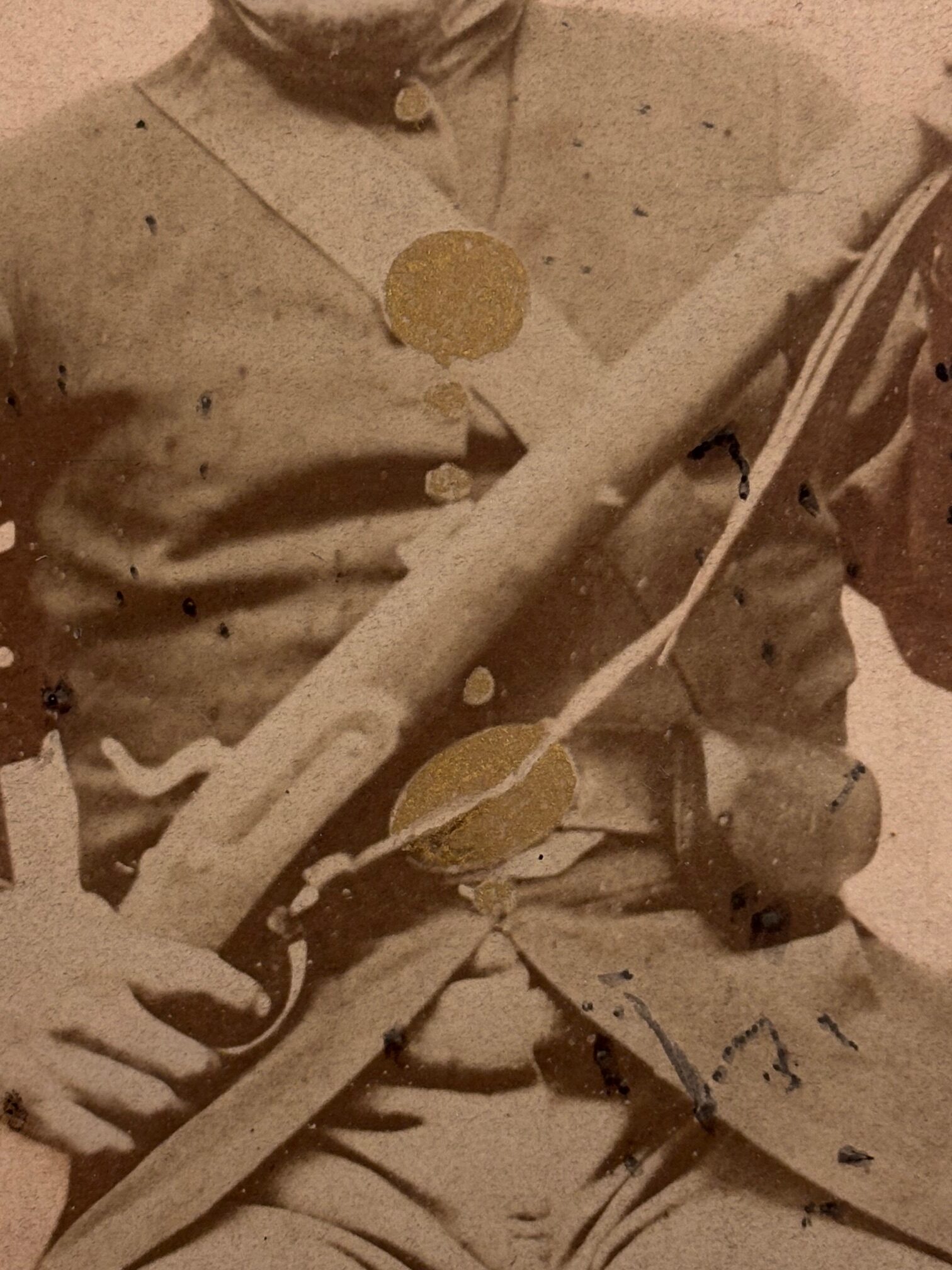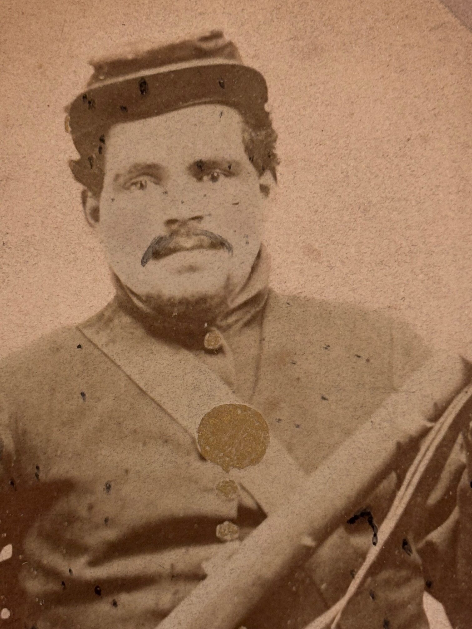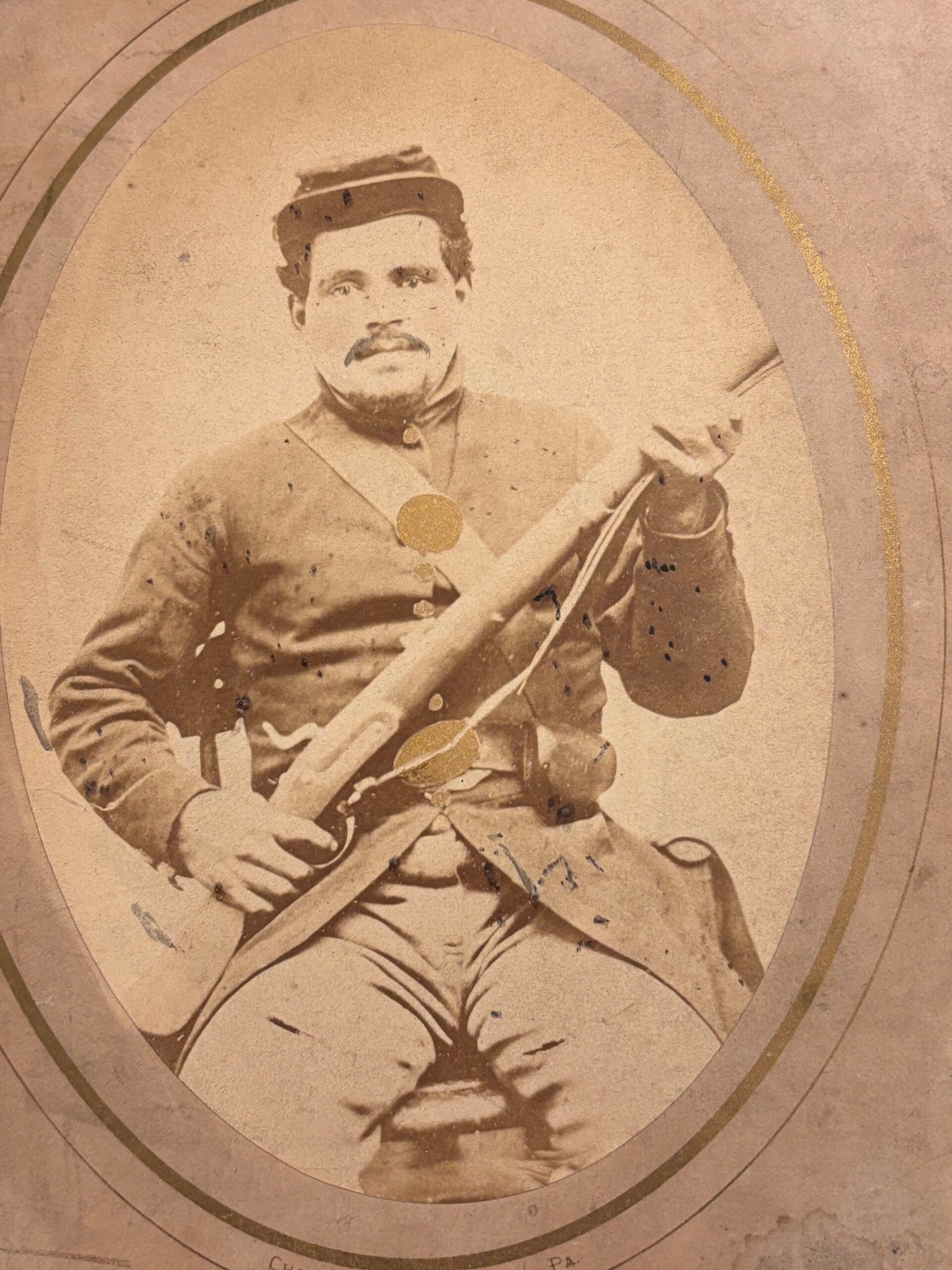 Although there was a John G. Bensing who served in the 8th U.S. Cavalry during the Spanish American War, this John A. Bensing served in the 87th Illinois during the Civil War, as noted by the various accoutrements, uniform elements and weapon; apparently, someone in the Bensing family mistakenly believed that their grandfather served during the Spanish-American War. In the image, Bensing is wearing a M1858, enlisted, nine-button frock coat, and forage cap; his accoutrements include a cartridge box with shoulder sling (breast plate was gilded to obscure the eagle), percussion cap box and enlisted belt with plate (plate obscured by gilding); Bensing holds what appears to be a M1842 musket with a sling. The image is slightly toned but remains in overall good condition. Bensing enlisted in August 1862 and mustered out in June 1865; his regiment would spend most of its wartime service in the western theater, with their last engagement in North Carolina at the Battle of Bentonville.