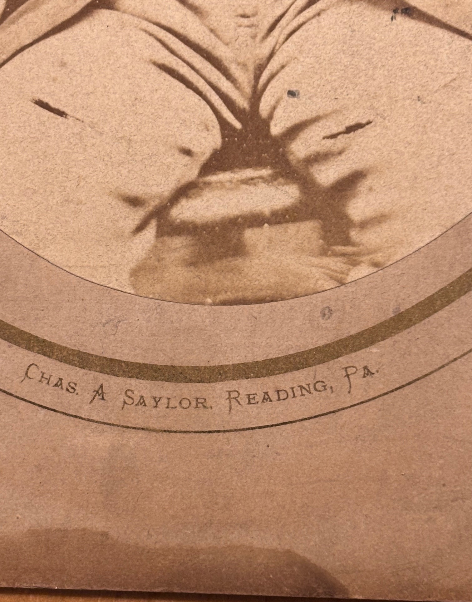 Beneath the image proper, below the circumferential oval gold decorative ring, is the name of the photographer: “CHARLES A. SAYLOR. READING, PA.” – He was known in the Reading area for his photography and during that time was the oldest active member in his profession. He was well known for photos of Civil War soldiers. There is a partial collection of his work in the New York Public Library. Through the years, he had studios at various locations in the city. Later he owned and operated the New York Gallery in Reading. During earlier years, he was active in politics, a Republican and served three terms (1873-1883) on the Ward 7 school board. He retired in 1912 after the death of his wife, Elmira, followed three months later by the loss of his only daughter, Nellie. A 1920 census recorded him living with his son C. Clifford and his wife Emma. He died there the following year from heart failure. His estate was valued at $25,000. His will provided for his six grandchildren the sum of $1600 and the remainder of his estate was to be divided among his three surviving children– Harry, Clifford and Frederick.