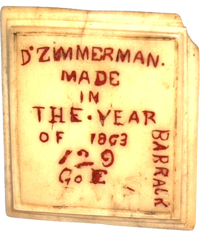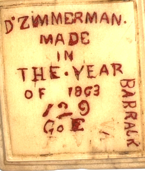 Id’d Carved Bone Cravat or Neckerchief Slide – Private David Zimmerman Co. E 129th Pa. Infantry – KIA at Chancellorsville – We have only had one other cravat slide that has the soldier / maker’s name on the slide; this example exhibits the name and regiment of the soldier who undoubtedly made the slide. Carved into the face of the slide, filled in with red and blue paraffin, with one inscription unfilled, is the following: