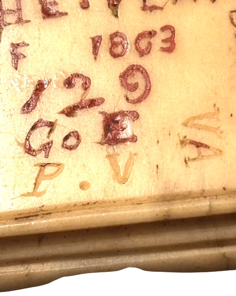 David Zimmerman, a resident of Schuylkill County, PA., enlisted into Co E, of the 129th Pennsylvania Infantry, in August 1862. With his regiment, Zimmerman would see action at Antietam, Fredericksburg, participate in the “Mud March” and sustain mortal wounds in action at Chancellorsville. The cravat slide remains in excellent condition, with a minor chip visible out of the upper right corner; the cravat ring on the back of the slide appears to have been cracked a long time ago. Zimmerman’s carving of his unit’s state of origin, is shallow and not filled with a colored paraffin. We are not sure what the significance of the vertically carved word “BARRACK” is on the face of the slide, although it may be a reference to his hut site during the winter of 1862-1863. The 129th Pennsylvania Infantry, part of the Army of the Potomac’s V Corps, spent the winter of 1862-1863 around Falmouth, Virginia, near the Rappahannock River, after the devastating Battle of Fredericksburg, digging in for winter quarters amidst mud and hardship while facing Confederates just across the river, a prelude to the Chancellorsville Campaign.