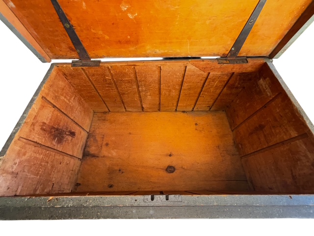This trunk remains in excellent condition, retaining the majority of its original paint and its sail cloth, top cover. Painted on the front of the trunk is: