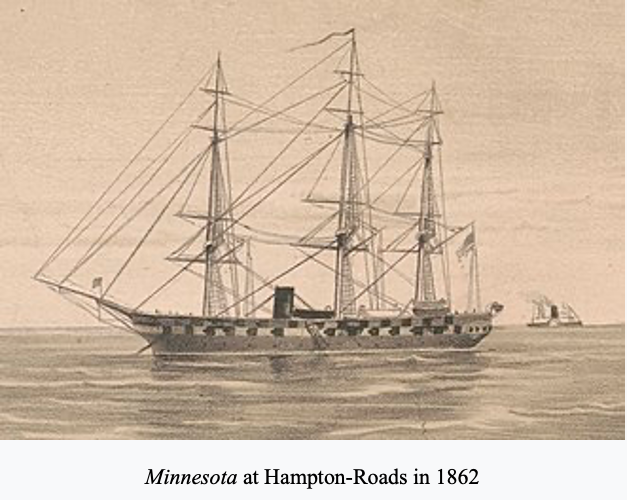 For the next few years she served as flagship of the North Atlantic Blockading Squadron for the Union Navy / United States Navy. During the Battle of Suffolk at Norfleet House on 14 April 1863, four of the Minnesota‘s sailors, Coxswains Robert Jordan and Robert B. Wood and Seamen Henry Thielberg and Samuel Woods, earned the famous congressional Medal of Honor while temporarily assigned to the accompanying USS Mount Washington. While anchored off Newport News on 9 April 1864, the Minnesota was attacked by the Confederate States naval torpedo boat Squib, which exploded a torpedo charge alongside the federal warship, fortunately without causing substantial damage and escaped.