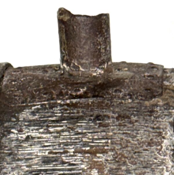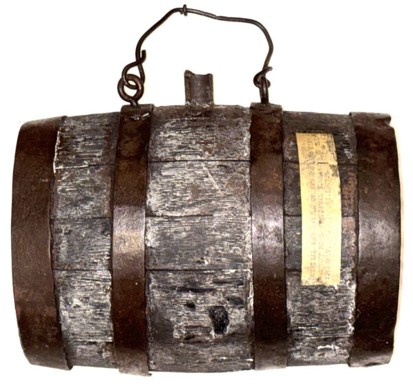 War of 1812 Hospital Keg Style Canteen Picked Up in New Orleans during the Civil War by Oliver W. Marvin Co. I 176th NY Infantry – This early keg provides a unique window into two wars that encompassed the United States – the War of 1812 and the Civil War. This somewhat diminutive keg is constructed of oak staves, held together with wrought iron straps which are riveted together. On the side of the keg is a crudely formed, canteen mouthpiece of sheet iron which is inserted into a square, sheet iron plate which is, in turn, attached to the body of the keg via small tacks. Affixed to two of the iron retaining straps, on another side of the keg, are two eyehooks, through which a length of heavy gauge, iron wire is threaded to act as a crude carrying device. On the side of the keg is an old, typed label that reads: