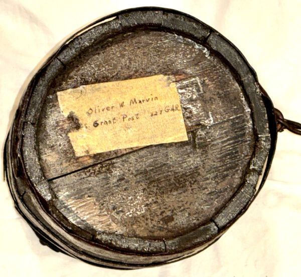 The Civil War soldier who’s name appears on the keg was Oliver W. Marvin who initially enlisted in November, 1862 in 52nd NY National Guard, but, shortly thereafter, transferred into Co.I of the 176th NY Infantry. Marvin was with his regiment in New Orleans as part of the Army of the Gulf in the defense of the city in early 1863, when he was promoted to the rank of Corporal; he was recorded as a POW in the end of June, 1863, having been captured at Bayou Boeuf, Louisiana; he was paroled on August 17, 1863 and returned to his regiment Apparently during his tenure in the New Orleans area, Marvin visited the Convent of the Ursuline Nuns; the nuns in residence, in 1815, established a hospital, at the Convent, after the Battle of New Orleans. It appears that Corporal Marvin took this keg, as a souvenir, from the convent, bringing it to his GAR post, after the war. We will include with the purchase of this keg / canteen three GAR Post 327 ribbons from the early 20th century. The keg / canteen remains in overall very good condition.