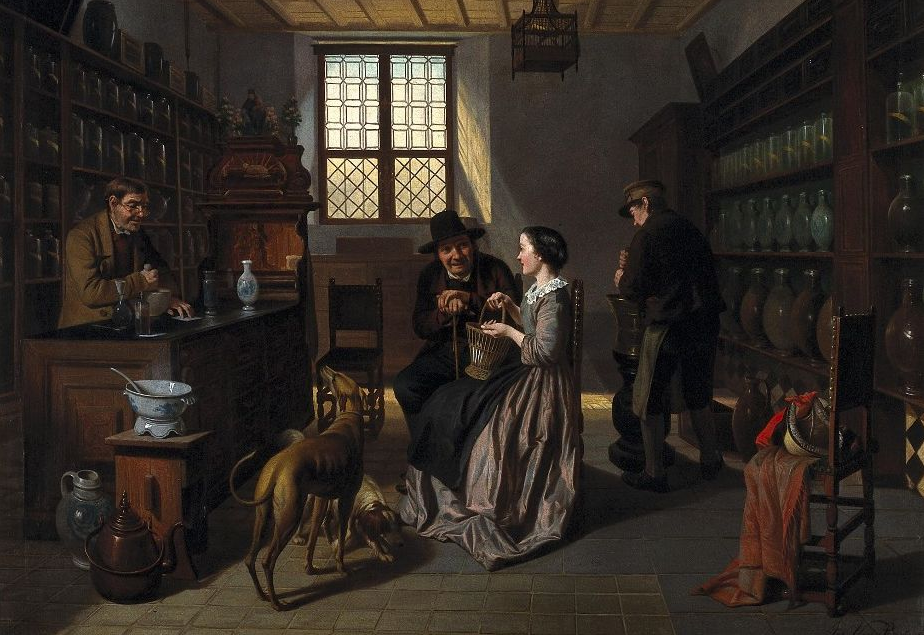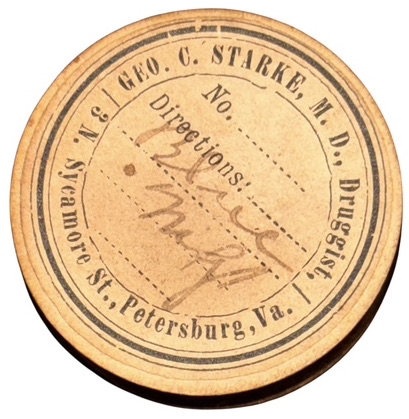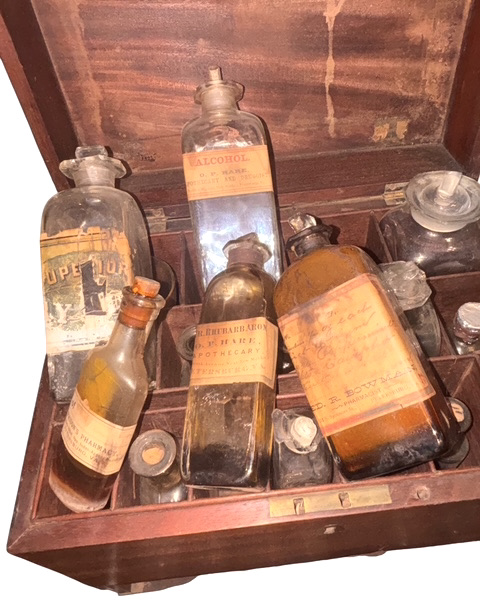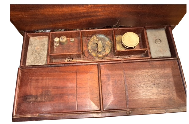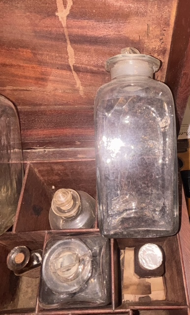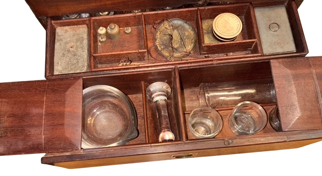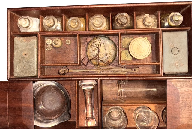 C. 1840 – 1855 Petersburg, Virginia Apothecary Chest – This circa 1840-1855 English made, mahogany apothecary chest has brass fittings, to include brass carrying handles on each side of the chest, indicating possible design for military use . The Apothecary was the forerunner to a pharmacist, formulating and dispensing medicines to physicians, surgeons, and patients. Apothecaries’ investigation of herbal and chemical ingredients was a precursor to the modern sciences of chemistry and pharmacology. This superbly crafted apothecary chest is made of figured mahogany with oak as a secondary wood, indicative of English manufacture. In the lower section of the chest is a covered drawer-like compartment, also made of mahogany; this section contains an extensive array of mid-19th century, pharmaceutical instruments and glassware to include a mortar and pestle, various measuring cups and a graduated cylinder; additional apothecary devices are contained within this compartment – a small set of scales for weighing doses, two tin containers of unknown, powdered medication; a tray in the compartment lifts out to reveal a lower, smaller compartment that has some additional medical devices for unknown uses. In the top of the box are numerous compartments, each containing original, period medical bottles many still exhibiting original labels with the name of the medication and that of the pharmacist or apothecary; virtually all of the medicine bottles with labels, are from various apothecary establishments in Petersburg, Virginia and appear to date towards the end of the Civil War or shortly thereafter. Many of the bottles in the chest are from an antebellum period, as most have sheared pontils on their bases. The actual chest dates to many years prior to the war, and several of the bottles are markedly earlier than 1861; we assume that these bottles represent the first components of the chest and may have been re-used by a later apothecary. Some of the medications contained in the chest include: Laudanum, Ipecac, Calomel or “Blue Mass” and a variety of other 19th century pseudo-medicinal medicines. The chest and its components remain in overall, very good condition. We have had one or two other early apothecary chests; this is by far the most complete chest we have had or even seen. The chest and contents remain in overall very good condition.