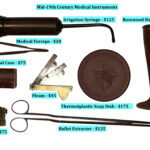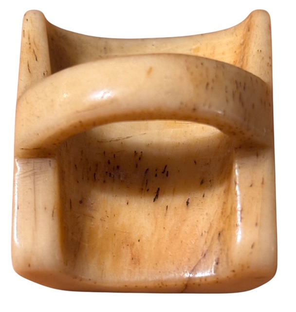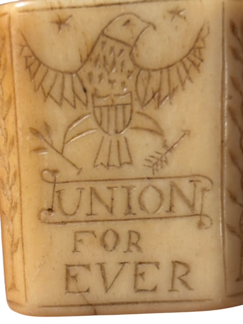 Patriotic Motif Civil War Soldier Carved Bone Cravat or Neckerchief Slide – During the course of the Civil War, with much time spent by soldiers in camp or, in some cases, imprisoned as POWs, men often, with substantial time on their hands, would carve out of bone, wood or even ivory, scarf, cravat or neckerchief slides, intended to allow the soldier to adequately secure a scarf or cravat thereby enabling the wearer to tighten the textile around the wearer’s neck. Some of these slides that we have had have soldier’s names and regiments enhanced by detailed decorative elements. This example, although not having a name or regiment carved in it, does have an impressive, artfully carved American Eagle and the patriotic motto – “UNION FOR/EVER”. This slide is carved cow bone and remains in excellent condition.