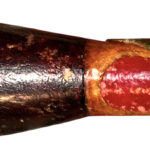 Given the enumeration of Kilbourn’s location at 119 Orange St. in Albany, this drum was manufactured by him between 1850 and 1857, prior to the onset of the Civil War. This drum remains in overall excellent condition – the polychrome painted eagle and additional patriotic decorative elements remain vivid and have not been re-touched or over-painted; the flesh hoops retain their red hue – the lower hoop appears to have been broken during the period of use and repaired during that time, as period, copper rivets and a thin iron band were utilized to make the repair; the bent maple body of the drum is in great condition and displays a significant, brass tack pattern; viewing into the sound hole, George Kilbourn’s label is clearly visible; the roping is old, but may not be the original roping; the tension ears are correct, but seemingly more recent replacements; the upper head is original and displays two areas of repair (one appears to be period); the lower head is a more recent replacement; the drum appears to be in its original size and not cut down – Height: 15.5”; Diameter – 16.5”. Overall, this is a fine example of a pre-Civil War to Civil War period, Federal Regulation eagle drum that retains its original decorative, patriotic motif paint, tack pattern, height and diameter and maker’s label.