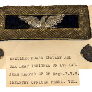 $750Id’d Insignia and Rank Strap – Lt. Col. John Harper – Field and Staff 95th Pa. Infantry (Gosline’s Zouaves)April 6, 2025 -