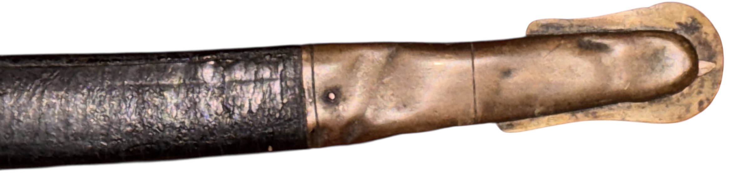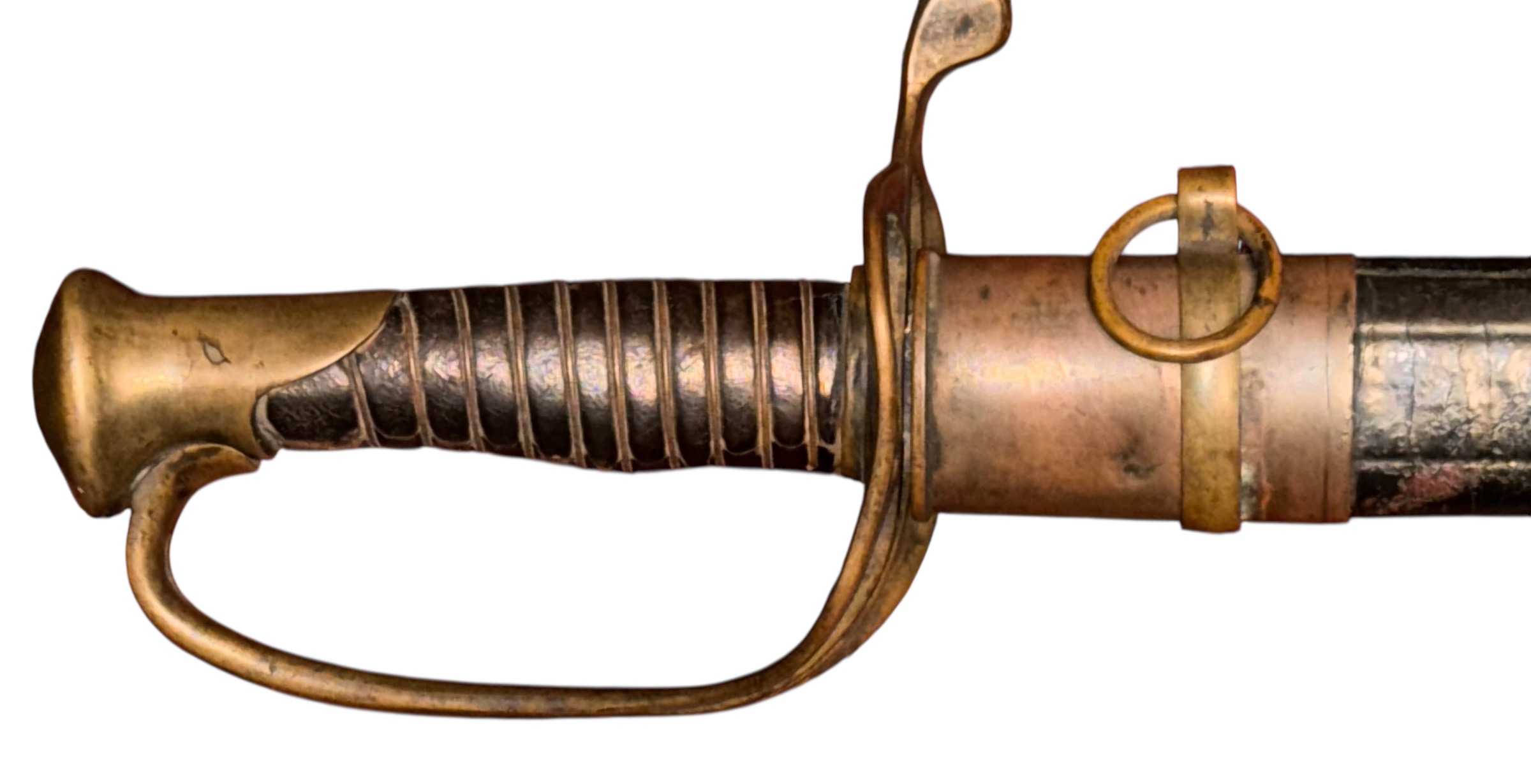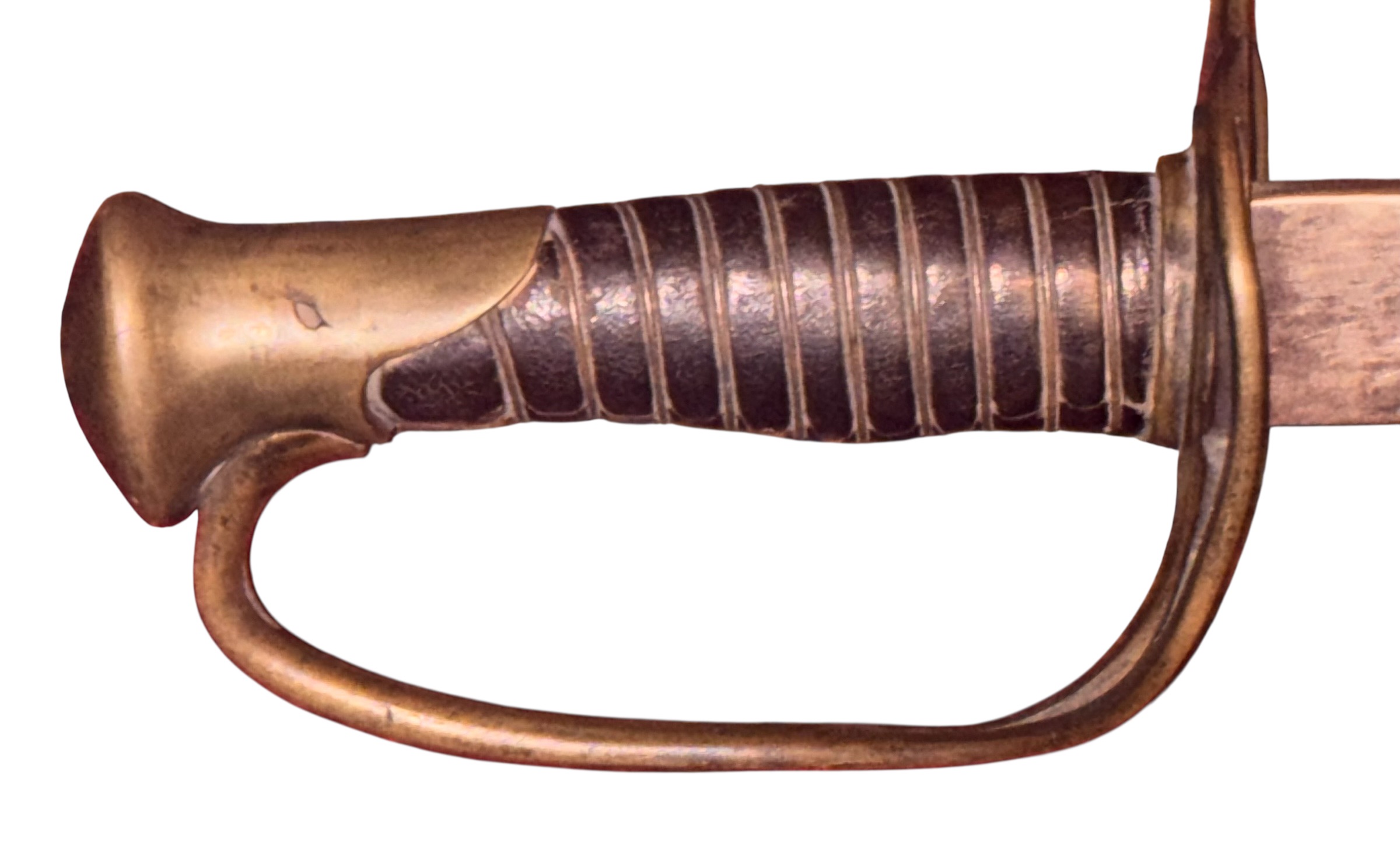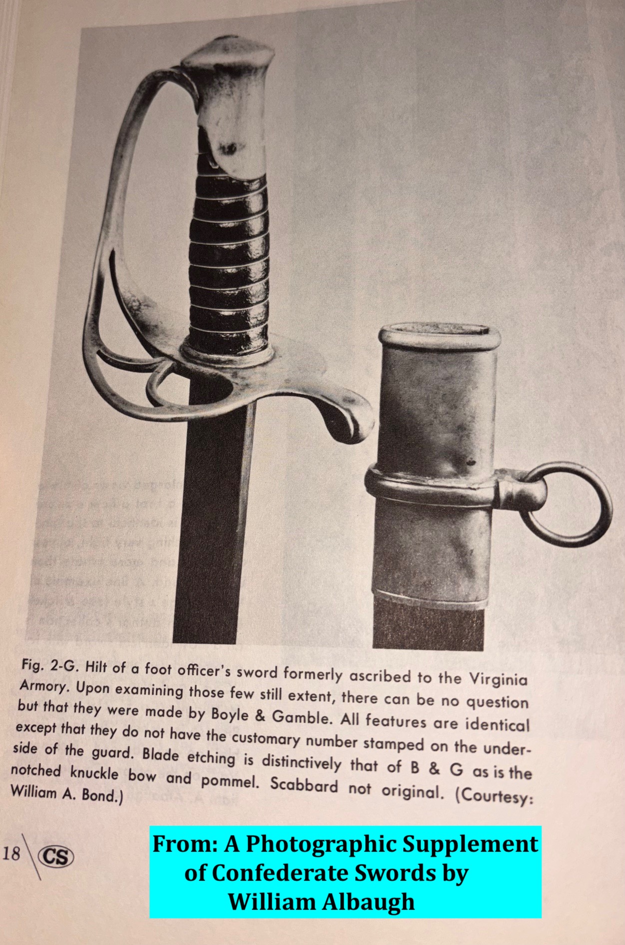 Id’d Boyle and Gamble Foot Officer’s Sword and Leather Scabbard – Located in Richmond, the Boyle and Gamble firm was the most prolific manufacturer of officer’s swords for the Confederacy – the production of some of the swords were contracted by the Confederate government, while some of the higher-grade models were placed with retailers like Mitchell and Tyler, in Richmond. Their foot officer’s sword, like this example, were comparable in appearance to the Federal Model 1850 Foot Officer’s sword. Generally intended for use by Lieutenants and Captains, some of these foot officer swords were occasionally carried by NCOs. This Boyle and Gamble foot has a single-branched knucklebow, with a slot for a sword knot, near the pommel cap; the knucklebow descends into a distinctive and rarely found branched or notched guard, in the so-called “V-shaped” configuration. The hilt has a russet brown, leather covered grip, in fine, complete condition, with a single strand, copper wire wrap. The pommel cap is a non-tiered, simple type, with an obvious casting flaw, often seen in Boyle and Gamble products. This sword retains its original, brass mounted, leather scabbard; these leather scabbards were often the product of the R.H. Bosher Carriage Factory in Richmond; prone to damage and field wear, leather scabbards are often difficult to find in decent condition – this scabbard remains in overall fine condition – the brass mounts and scabbard drag exhibit an appealing, “mustard yellow”, aged patina, as does the guard. The sword blade has a single, non-stopped fuller, with no secondary, small narrow fullers; the blade retains faint, original etching; there is no maker’s mark on the sword; the blade has an obvious casting flaw, seen in many B & G swords; the steel blade exhibits a dark gray color and does have some very small nicks in the cutting edge; no leather pad near the guard is present. There is a very slight “play” in the hilt. Virtually the same sword appears on p. 18 of William Albaugh’s “A Photographic Supplement of Confederate Swords”.