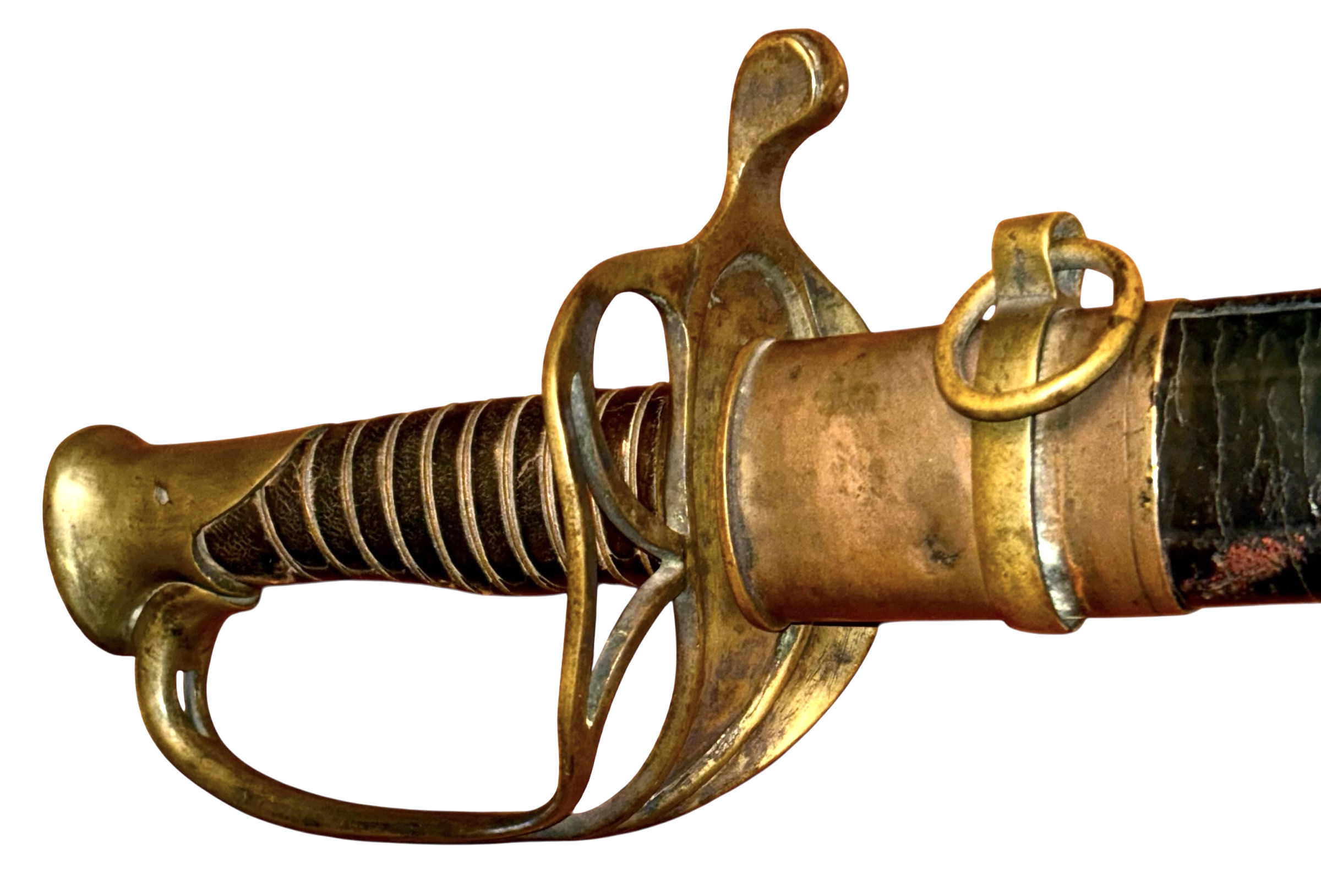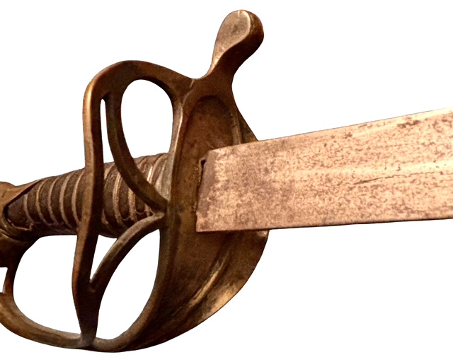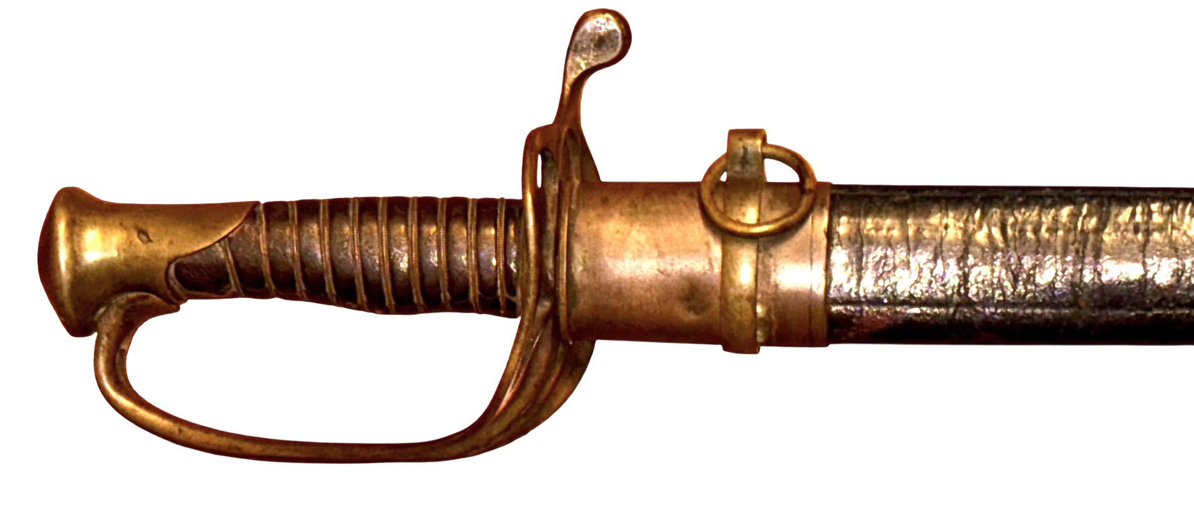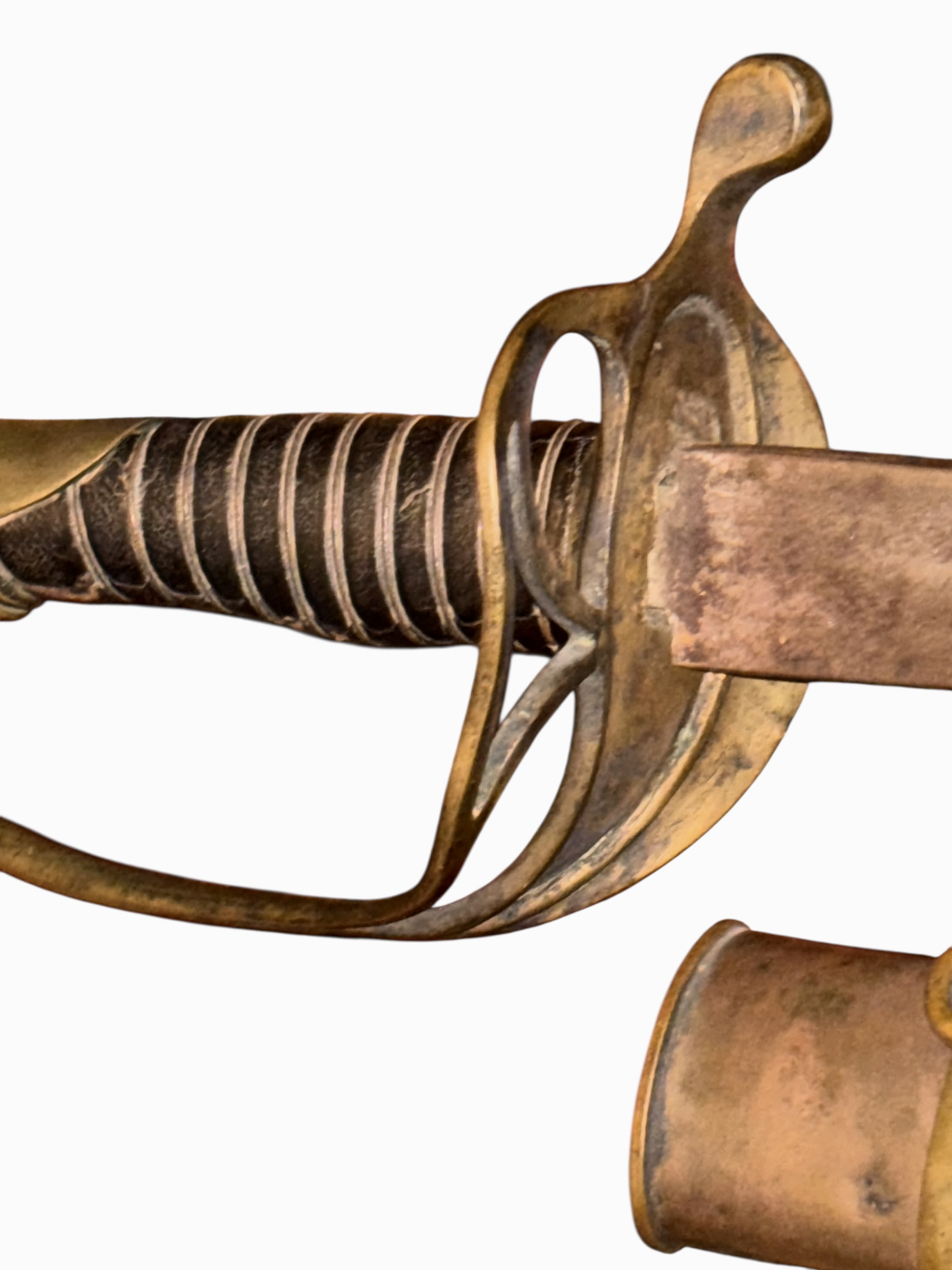Id’d Boyle and Gamble Foot Officer’s Sword and Leather Scabbard – Located in Richmond, the Boyle and Gamble firm was the most prolific manufacturer of officer’s swords for the Confederacy – the production of some of the swords were contracted by the Confederate government, while some of the higher-grade models were placed with retailers like Mitchell and Tyler, in Richmond. Their foot officer’s sword, like this example, were comparable in appearance to the Federal Model 1850 Foot Officer’s sword. Generally intended for use by Lieutenants and Captains, some of these foot officer swords were occasionally carried by NCOs. This Boyle and Gamble foot has a single-branched knucklebow, with a slot for a sword knot, near the pommel cap; the knucklebow descends into a distinctive and rarely found branched or notched guard, in the so-called “V-shaped” configuration. The hilt has a russet brown, leather covered grip, in fine, complete condition, with a single strand, copper wire wrap. The pommel cap is a non-tiered, simple type, with an obvious casting flaw, often seen in Boyle and Gamble products. This sword retains its original, brass mounted, leather scabbard; these leather scabbards were often the product of the R.H. Bosher Carriage Factory in Richmond; prone to damage and field wear, leather scabbards are often difficult to find in decent condition – this scabbard remains in overall fine condition – the brass mounts and scabbard drag exhibit an appealing, “mustard yellow”, aged patina, as does the guard. The sword blade has a single, non-stopped fuller, with no secondary, small narrow fullers; the blade retains faint, original etching; there is no maker’s mark on the sword; the blade has an obvious casting flaw, seen in many B & G swords; the steel blade exhibits a dark gray color and does have some very small nicks in the cutting edge; no leather pad near the guard is present. There is a very slight “play” in the hilt. Virtually the same sword appears on p. 18 of William Albaugh’s “A Photographic Supplement of Confederate Swords”.
